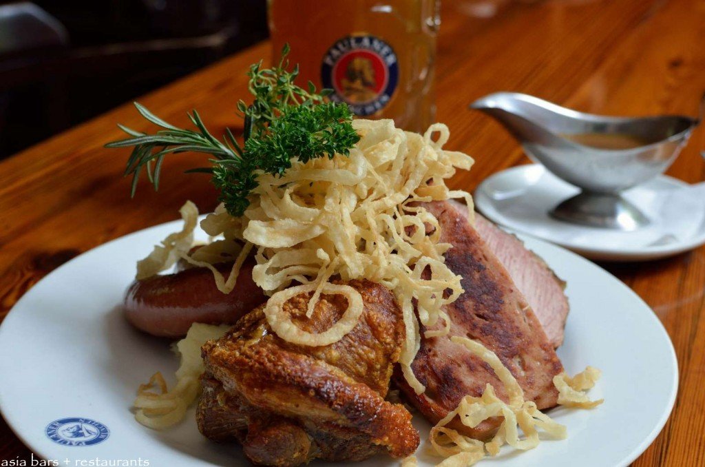 Paulaner’s Mixed Bavarian Combination- with Bavarian Sausages, Cured Pork Knuckle, Braised Pickled Smoked Pork Loin “Kassler”, Meat Loaf, Sauerkraut and Mashed Potatoes. One of the most popular choices on the menu.