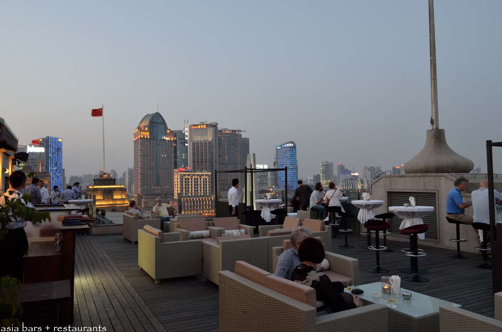 Evening “postcard” views of Shanghai from the rooftop terrace of the Roosevelt Sky Bar.