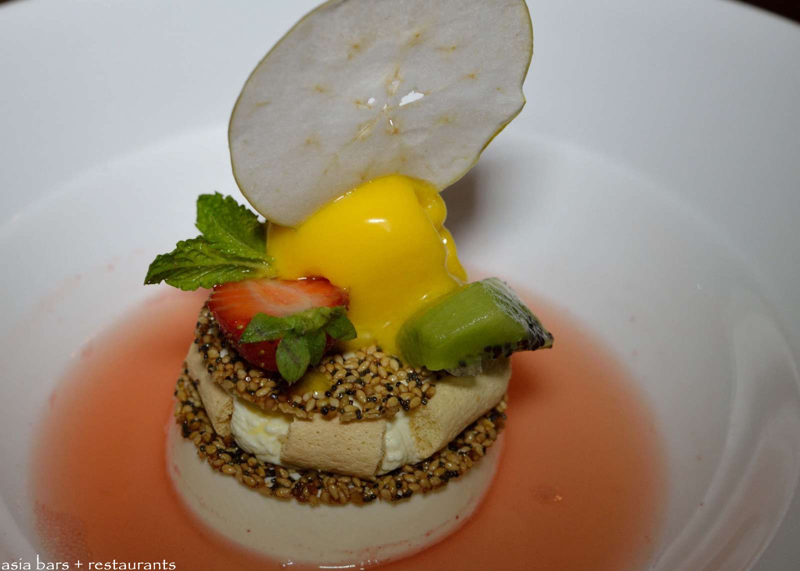 Passion Fruit Mascarpone Mousse & Mango sorbet with Watermelon jus.