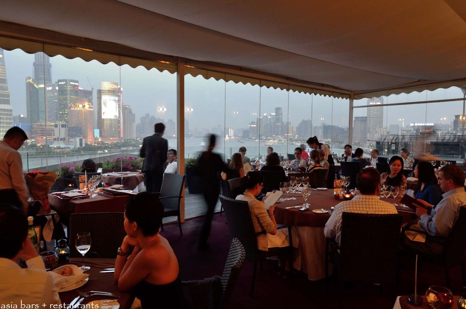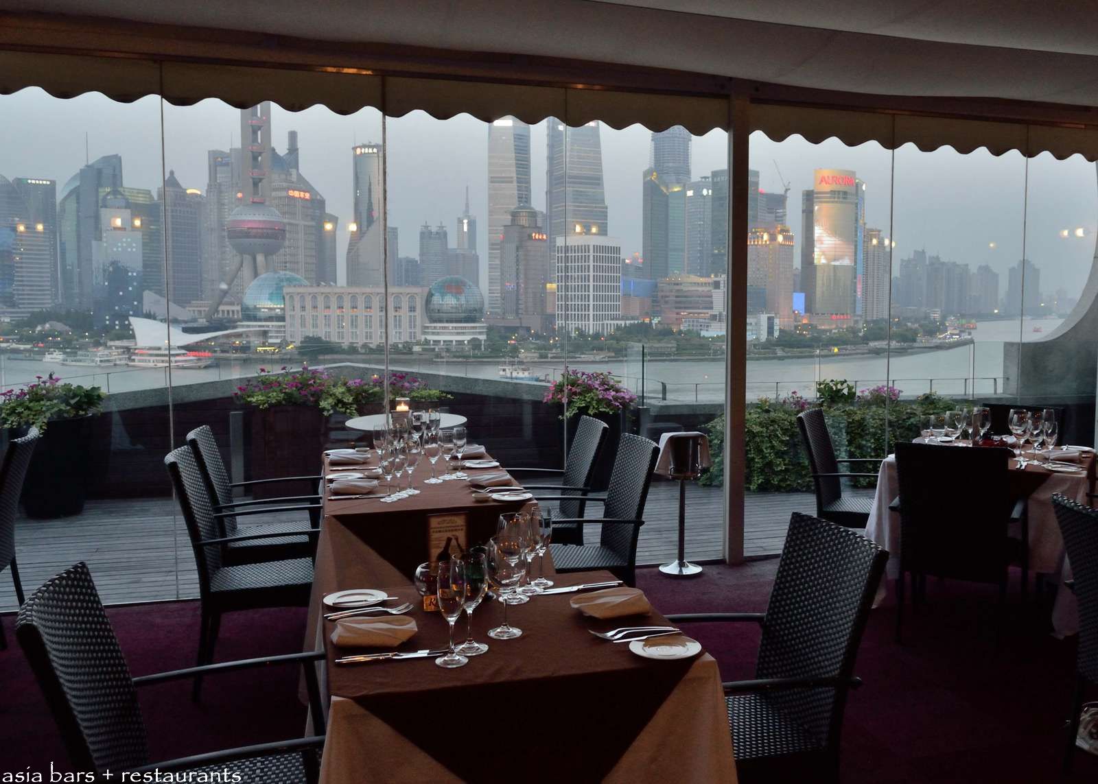 Outdoor dining terrace facing the southern expanse of the Huangpu river- and the Pudong office towers on the opposite side of the river.