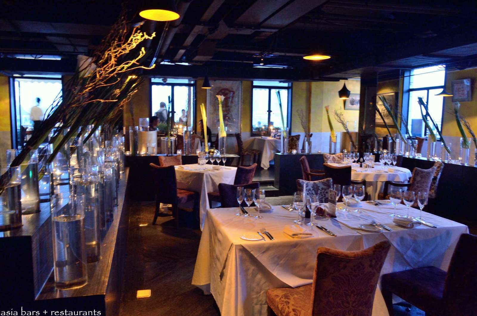 A distinctive decorative feature in the dining room are the series of tall glass vases holding alternating flower and dried branch arrangements.
