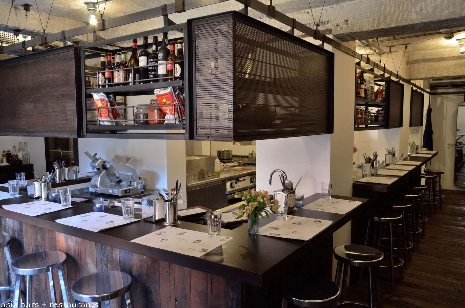 The tapas bar counter is faced with reclaimed timber boards that match the flooring and partial wall paneling. Industrial steel Chalkboards display daily menu specials. Paper place-mat menus are a feature of other Atherton tapas-style restaurants in Singapore and Hong Kong.