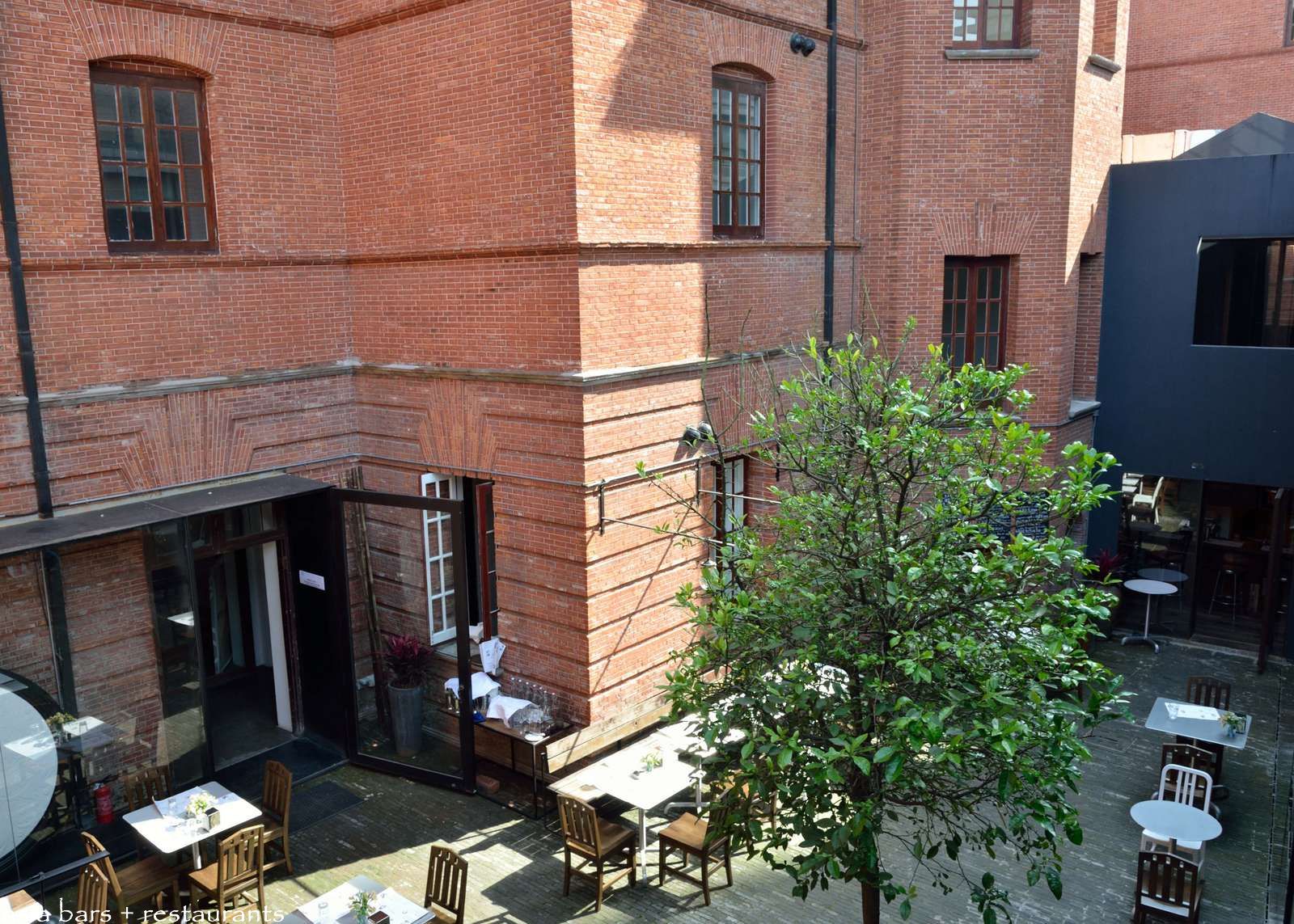 A couple of trees add a soothing “natural” element to the courtyard- enclosed within the red brick walled main building and the charcoal-grey rendered walls of the restaurant section.