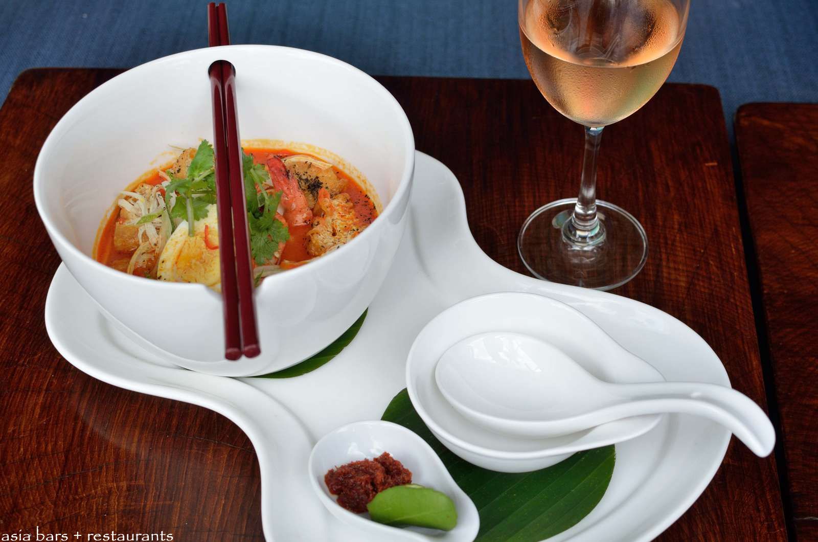 LAKSA NOODLES SINGAPURA – Shrimp, fishcake, tofu, lightly spiced coconut gravy. (Signature dish) Perfectly paired with a glass of chilled La Soif French wine.
