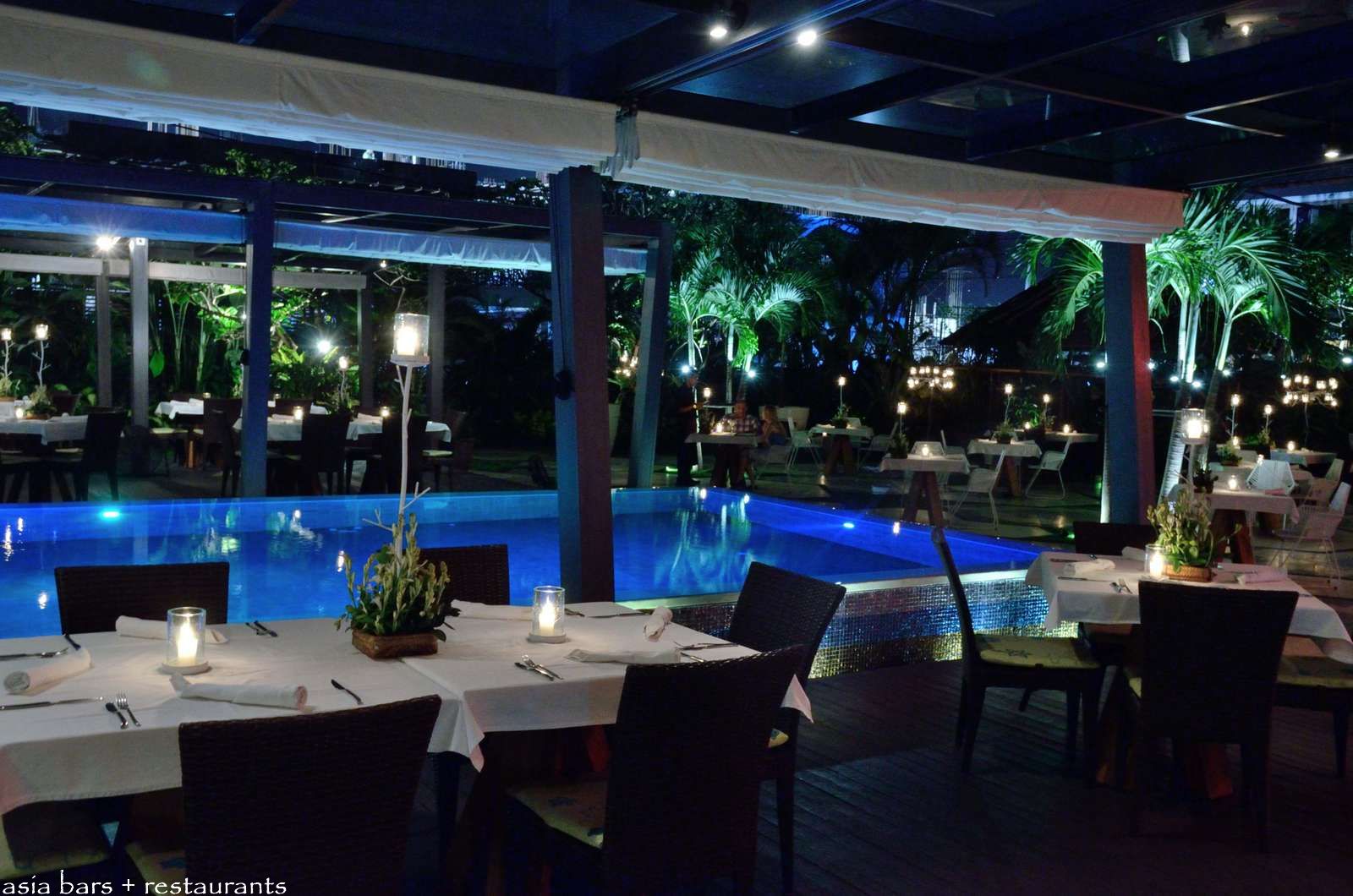 Dining at BABA’S is primarily at tables generously spaced around an open-air terrace garden- with a decorative pool at its centre.