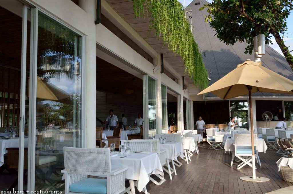 Looking across the outdoor dining terrace towards the main interior dining room- with bar and pool in background.