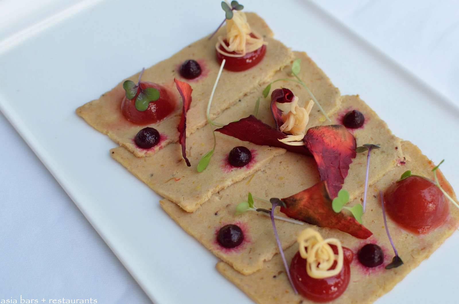 ‘Bumbu Bali’ Spiced Pork Terrine- Beetroot- crisps & gel Tamarillo- bubbles & granita. Pickled banana blossom.