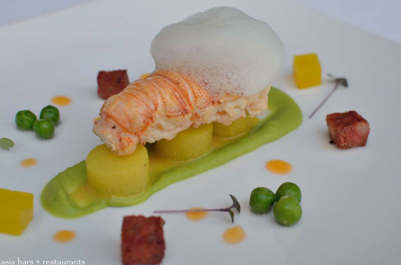 Grilled Deep Ocean Slipper Lobster- Curried labusiam, lemon pea puree, chorizo, kaffir lime air.