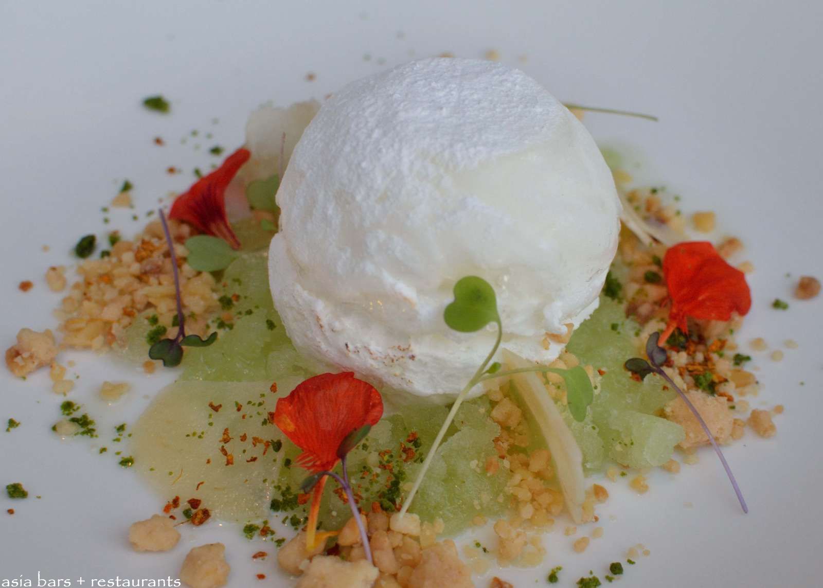‘Cocoons Snow Egg Tribute’ Balinese flavors- Crispy meringue outer, palm sugar & turmeric ice cream center, candlenut soil, shaved ‘salak fruit’ kemangi granita.