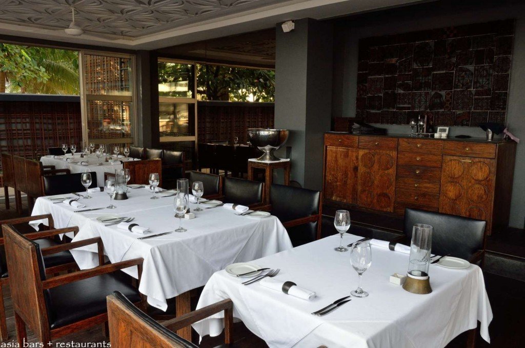 Elegant dining table settings in the main restaurant feature white table clothes, and comfortable black leather upholstered, teak framed chairs.