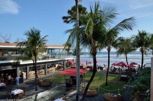 Green lawns of the central courtyard extend down a gentle slope to the sandy beachfront. Two rows of rustic solid teak day-lounges overlooking the beach and surf are the prized day time spots at KU DE TA- and particularly for the famed sunsets.