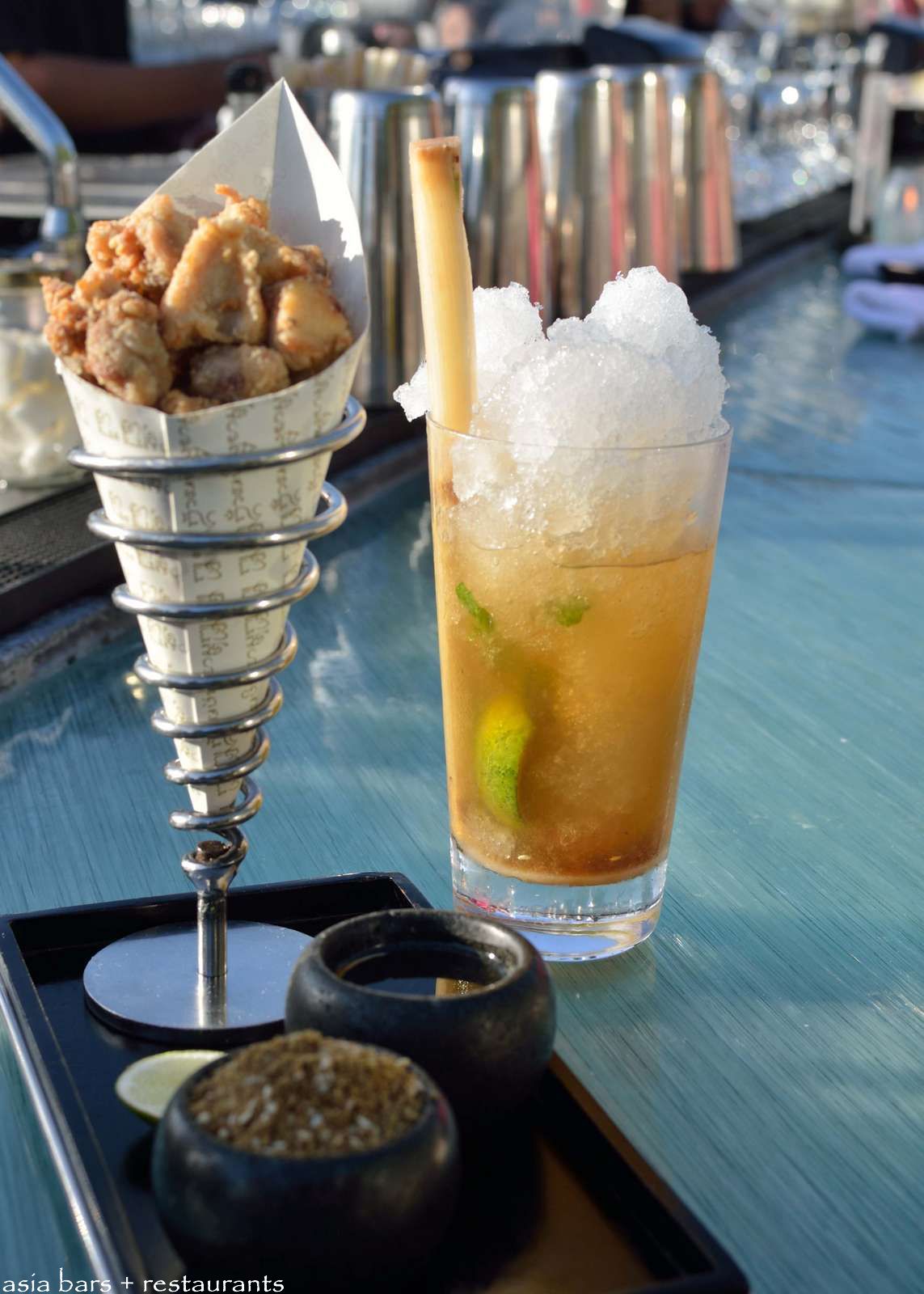 Notwithstanding the spectacular location and wonderful views, Rock Bar also distinguishes with its excellent beverage program. Offering an alluring cocktail list designed by an acclaimed international bar consultant, the accomplished mixologists at Rock Bar serve up their refreshing concoctions from behind the gorgeous glass-topped bar ( a custom creation of Japanese glass artist Seiki Torige). The selection runs to over 40 cocktails- both classics and contemporary creations- with a special focus on martinis. Signature drinks are listed as “The Rock Stars”– one of the standout drinks is- “Rock My World”– Vodka, Grand Marnier, Pineapple Juice, Grapefruit Juice, Fresh Orange. In addition to the cocktails, a full beverage range includes a good selection of international wines, champagne and sparkling (served by glass and bottle); local and international beers, and premium quality spirits. Light bites are available from a compact menu of gourmet tapas style dishes- both Asian and international.