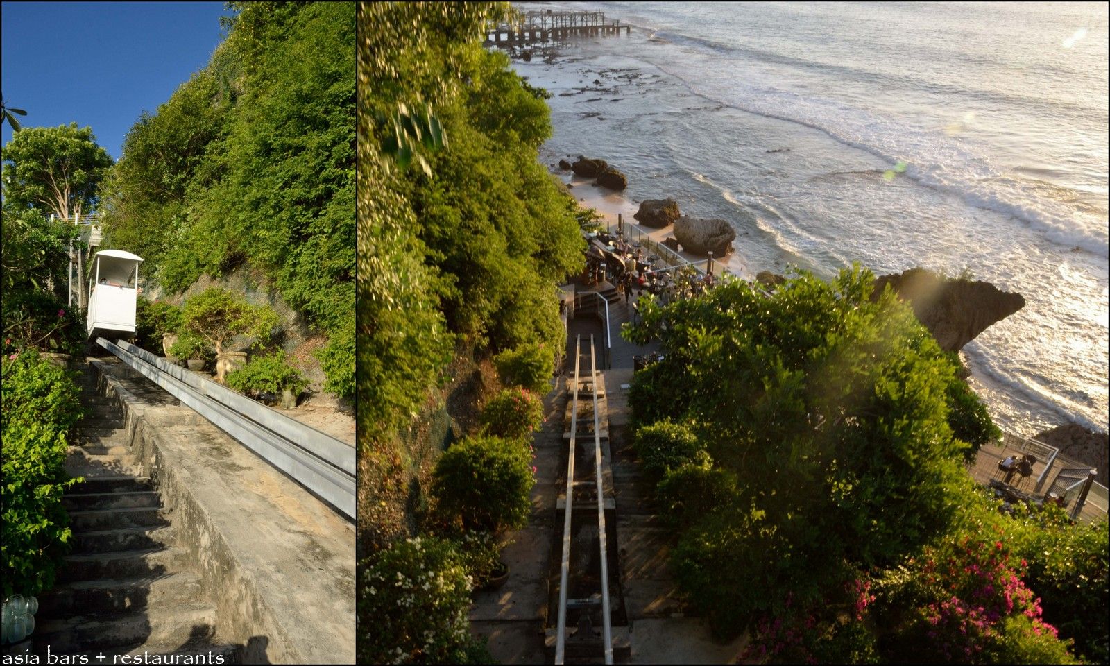 Access to the Rock Bar is dramatic in itself- via a small inclinator ( 8 people only) that tracks down the sheer cliff face