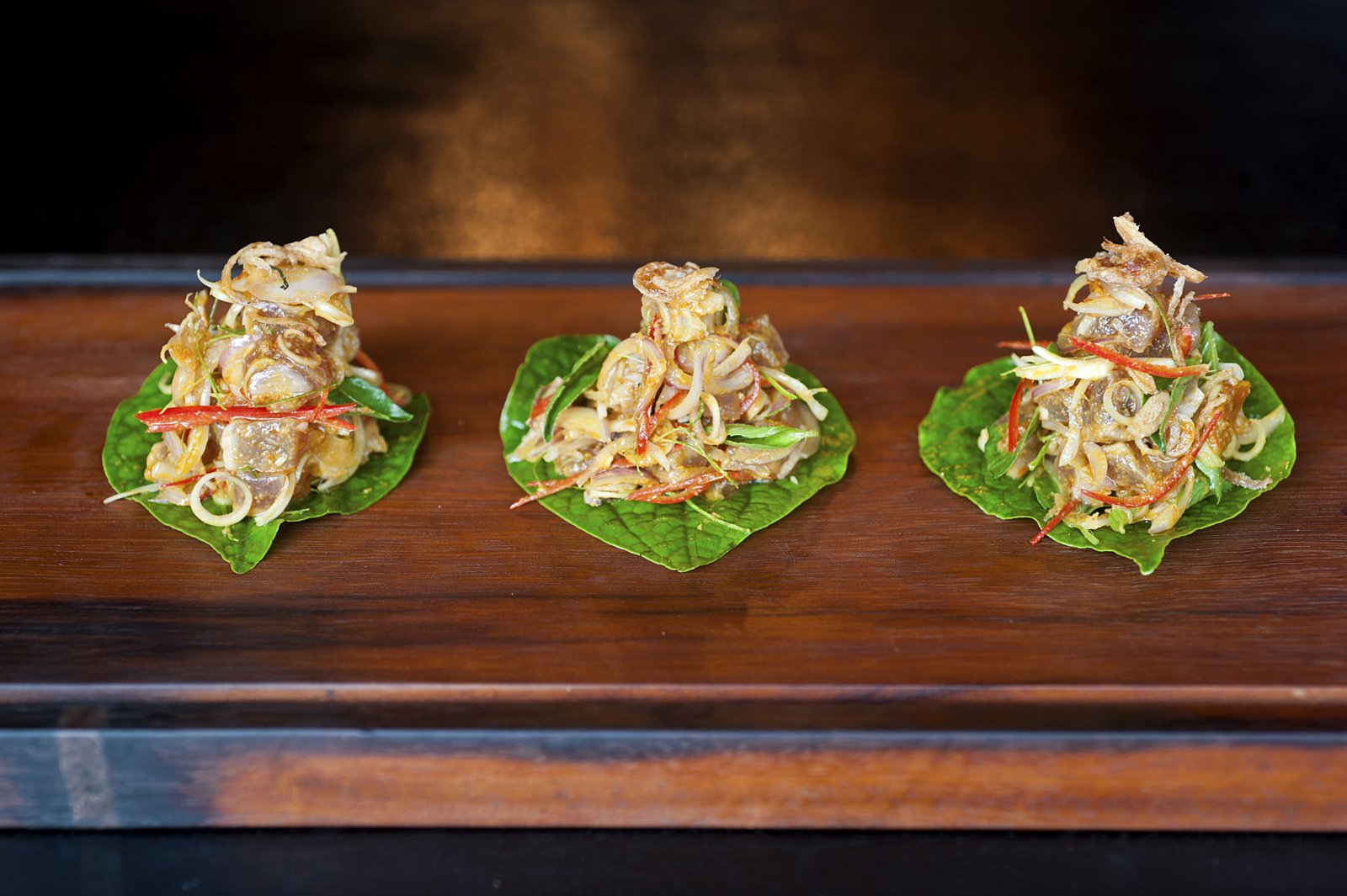 Signature betel leaf starters- a zesty tumble of raw tuna with lemongrass, shallots, and fresh lemon basil, with finely julienned chilli for a little kick.