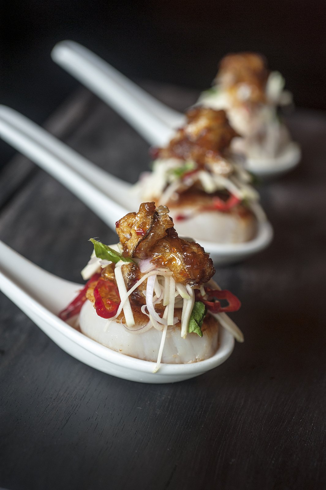 Seared scallops with green mango sambal and sweet, crispy salted fish.