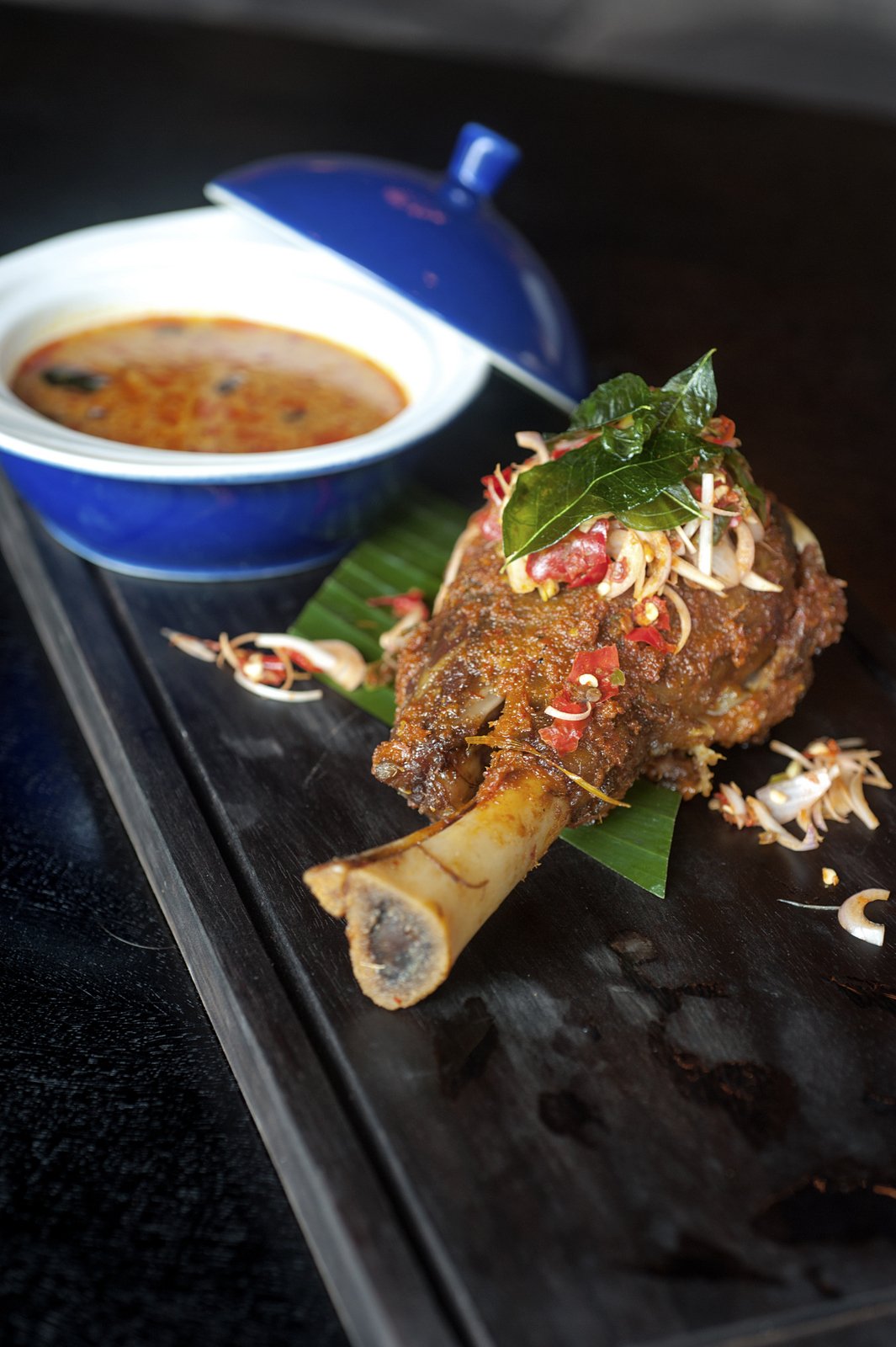 Grilled twice-cooked lamb shank- in western Sumatra spices and with shredded coconut curry leaves & ginger torch flower