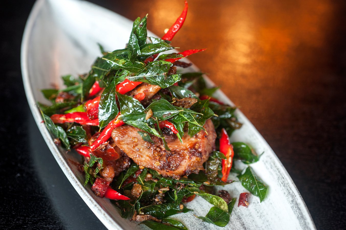 Crispy quail tangkap with chilli, pandan leaf and curry leaf.