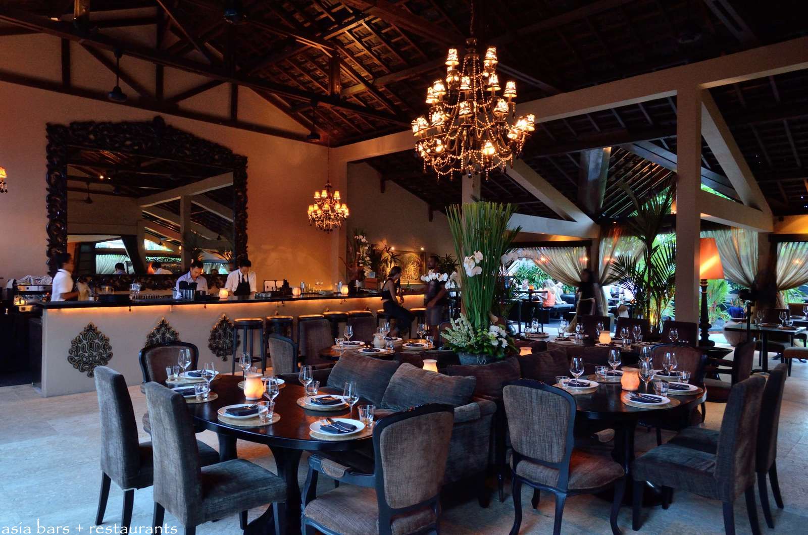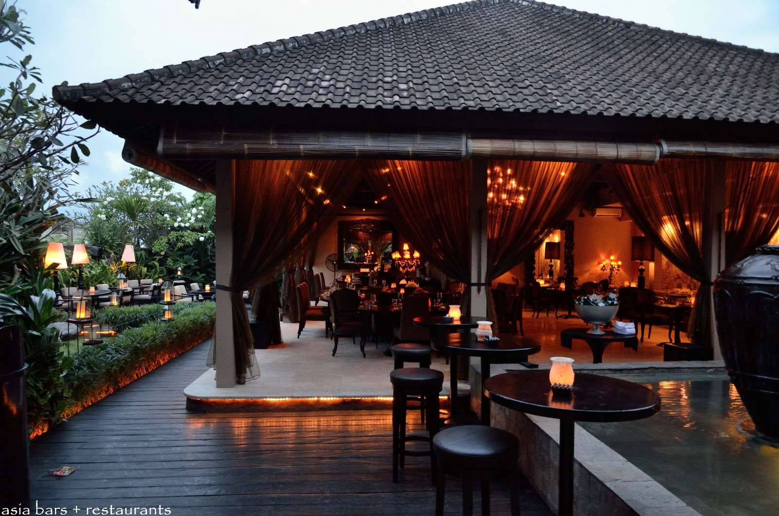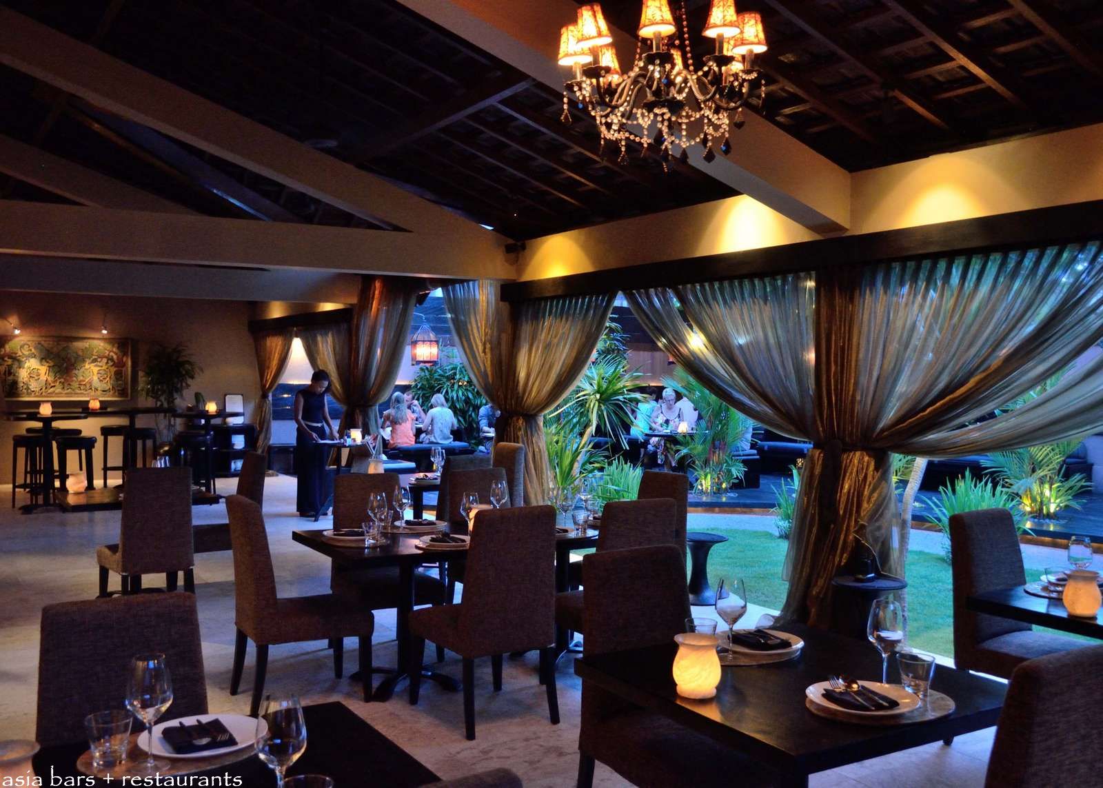 Open on two sides, the front dining pavilion with its traditional Balinese-style high ceiling exudes a luxurious spaciousness. Dining table settings include a centrepiece grouping of tables and sofas positioned back-to-back. Muted tones, and subdued lighting from the crystal chandeliers contribute to the refined dining atmosphere.