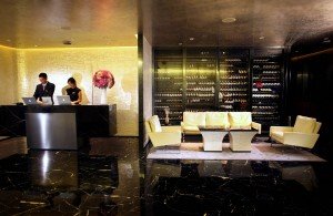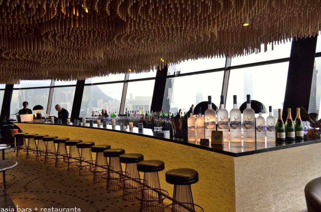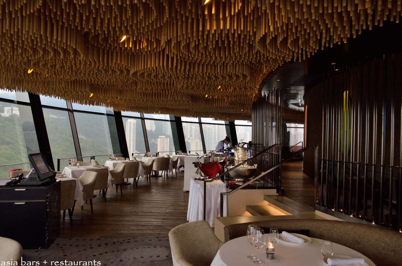 Although the views from the full height glass wall that wraps around the restaurant are truly spectacular, the designers have also created an intriguing interior that makes its own fashionable statement. The circular space features three sections- the main dining space, private dining, and a bar lounge area. Furnishings are modern but with a classic feel, dining tables covered in crisp white linen. The bar is an impressive structure eight metres long and topped with black marble and fronted with conical shaped bar stools that reference the circular profile of the Hopewell Centre. The most eye catching design feature is the unique ceiling decoration- an installation of over 50,000 suspended wooden sticks of varying lengths, formed into circular patterns to evoke a sense of being “in the clouds”.