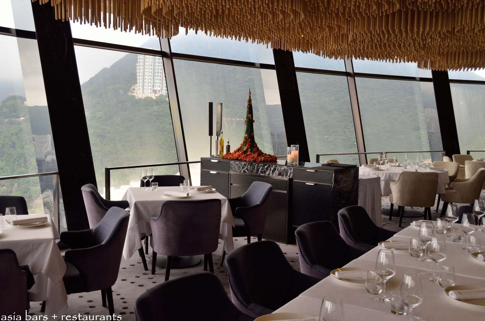 Window-front tables offer the panoramic views over the Hong Kong skyline and lush green mountains as the outer floor section slowly revolves- taking about one hour to complete a full revolution.