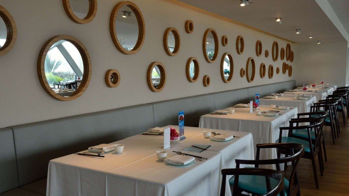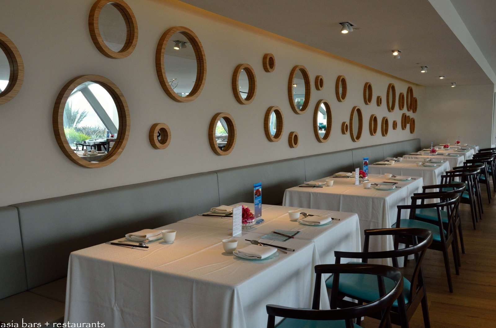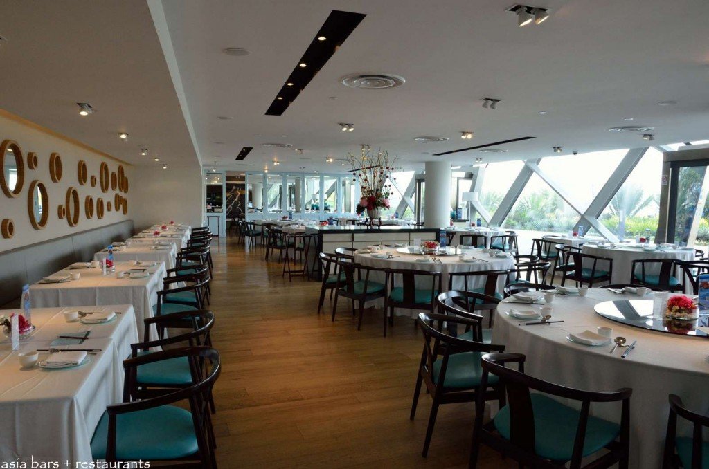 Dining tables are spaciously laid out across the long rectangular floor space. The full height glass wall bathes the interior in natural light during the day- creating a bright and relaxed environment for dining.