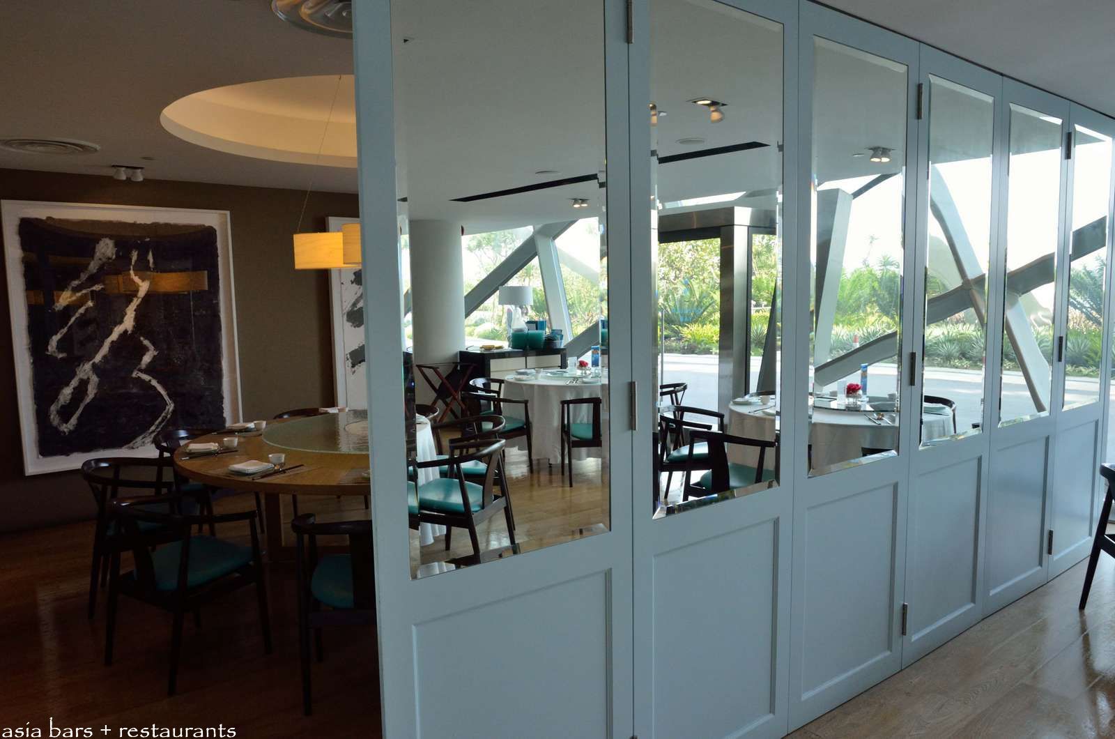 In a contemporary variation from the traditional Chinese large round dining tables, smaller tables that face the long banquette extend across the back wall. “Porthole” shaped mirrors decorate the wall- adding an elegant nautical reference to the decor.