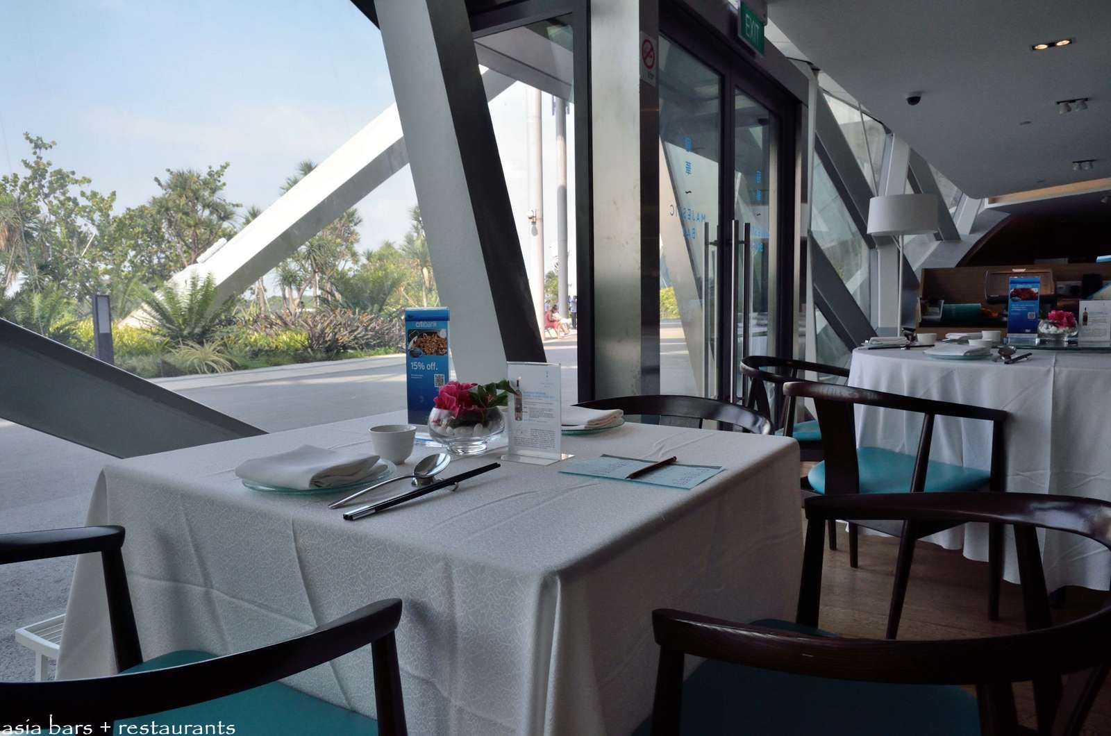 Window front tables provide excellent views across the gardens to the waters of Marina Bay.