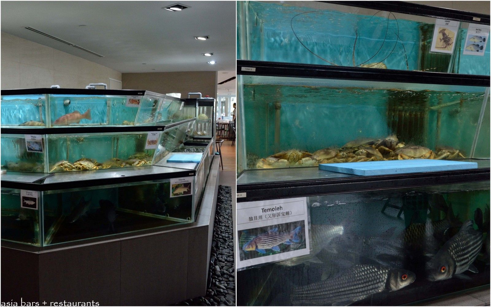 Customary with Chinese seafood restaurant convention- a series of glass tanks at the entrance showcase the live fish and crustaceans. Exotic species of river fish- sustainably farmed in Malaysia- are kept in the lower tanks.