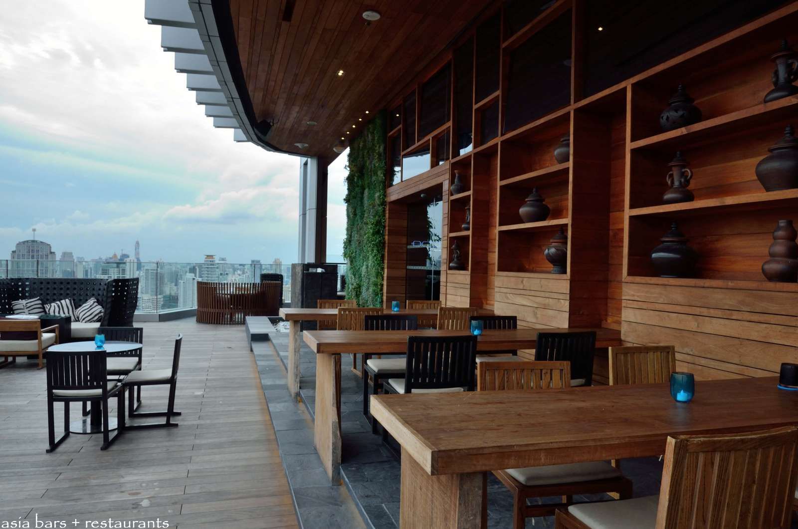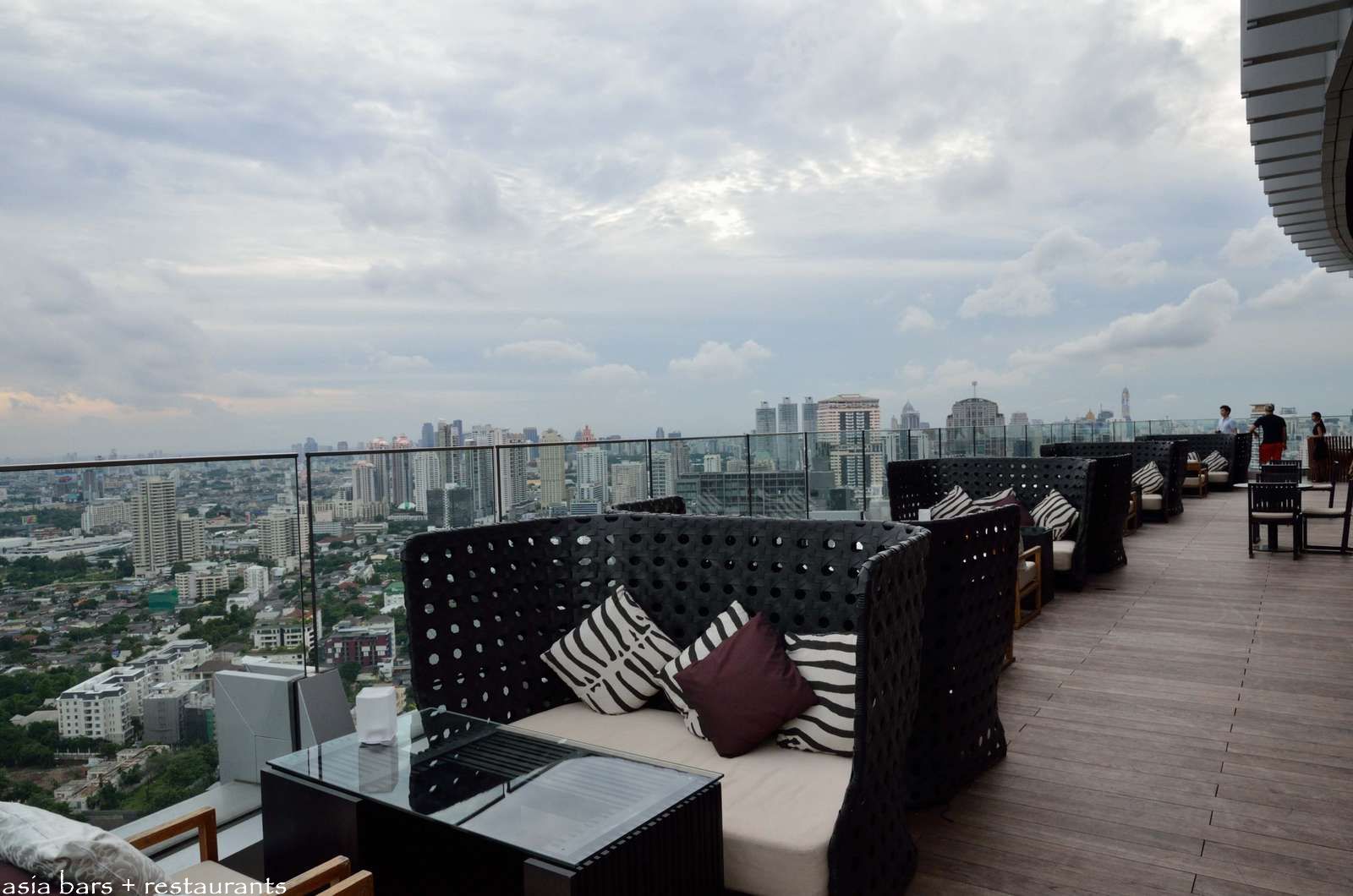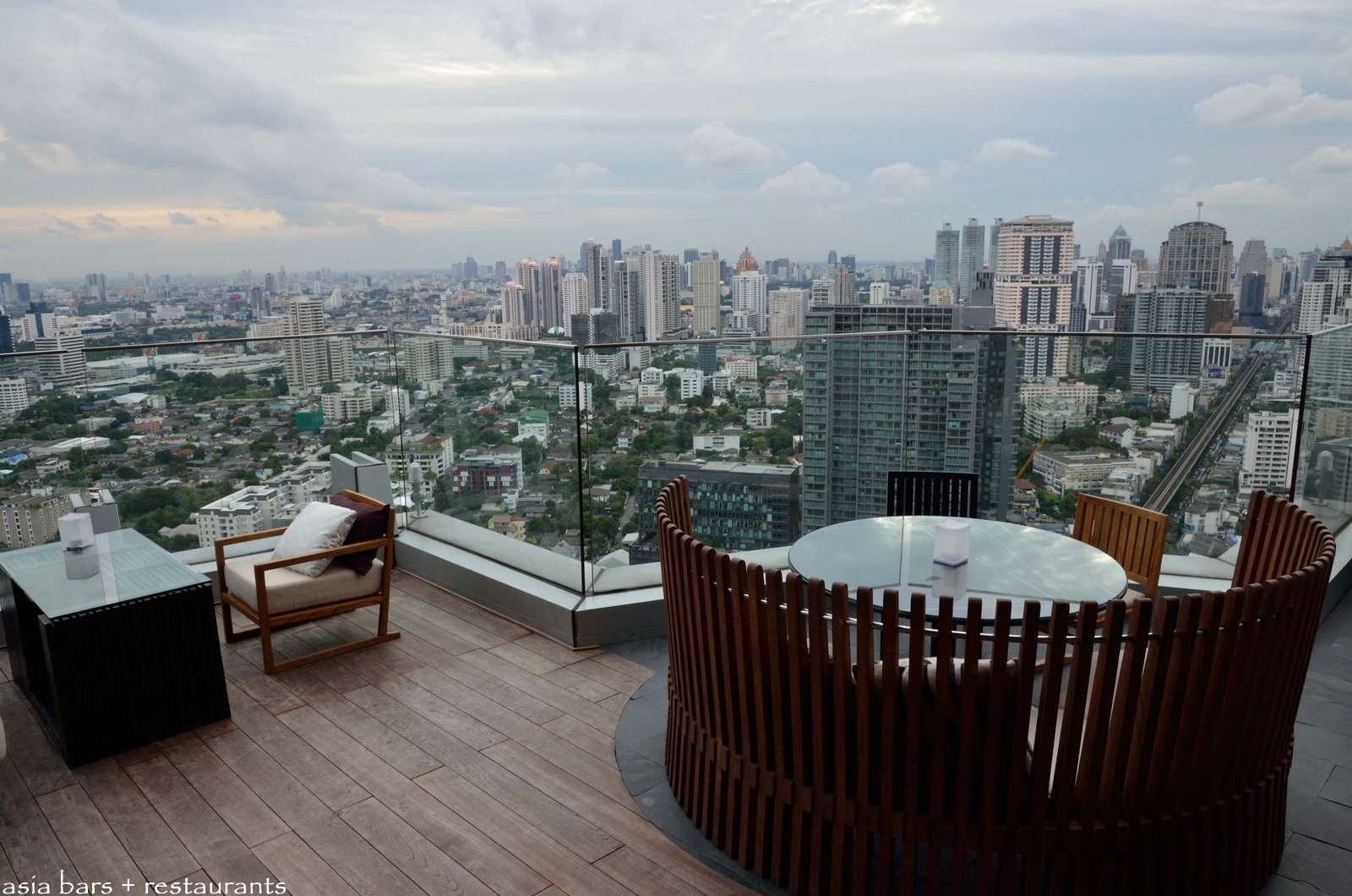 Patrons enjoy fabulous panoramic views over the Bangkok skyline from the tables and chairs fronting the chest- high glass wall.