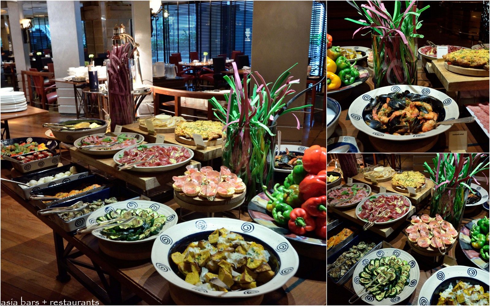 A broad array of antipasto dishes are showcased on the central table- including charcuterie cuts, fresh seafoods, vegetable dishes and salads.