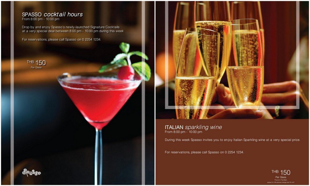 The culinary team at Spasso serve a finely executed, authentic Italian cuisine, embracing a rustic, regional style of cooking exemplified by wood fired-pizzas, pasta, salads, and grilled meats and fish. The popular Lunch Menu offers two set-price options – an unlimited antipasto table, plus soup and dessert buffet fro THB550++; or the spasso lunch– with unlimited antipasto table, soup, choice of main course, and dessert buffet for THB720++. In the evenings, a more extensive a la carte menu is served- offering a broad range of delicious traditional and modern Italian dishes.