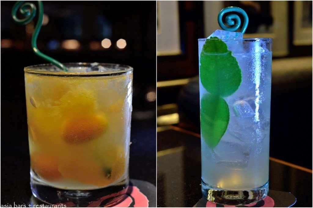 (L) Kumquats Smash- Kumquats have both sweet and sour elements -the skin is sweet, the juicy center is sour. The cocktail has an interesting balance of citrus fruit, aromatic gin, orange liqueur and the smoky nose of a single malt