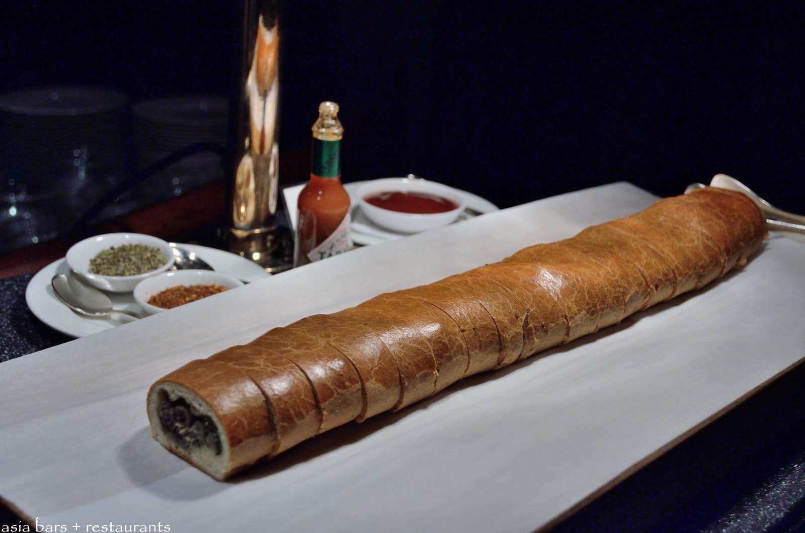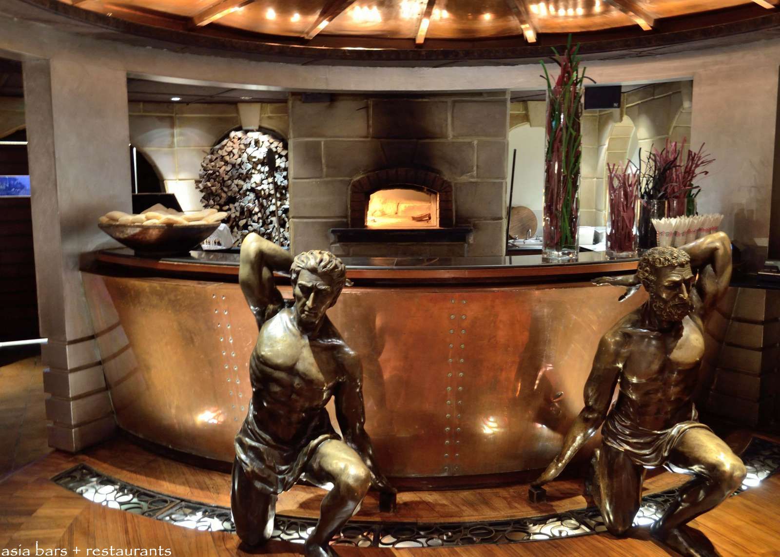 The wood-fired pizza oven is dramatically showcased at the far end of the central colonnade- occupying a dome-ceilinged alcove- matched with a copper-sheathed serving counter and striking bronze statues.
