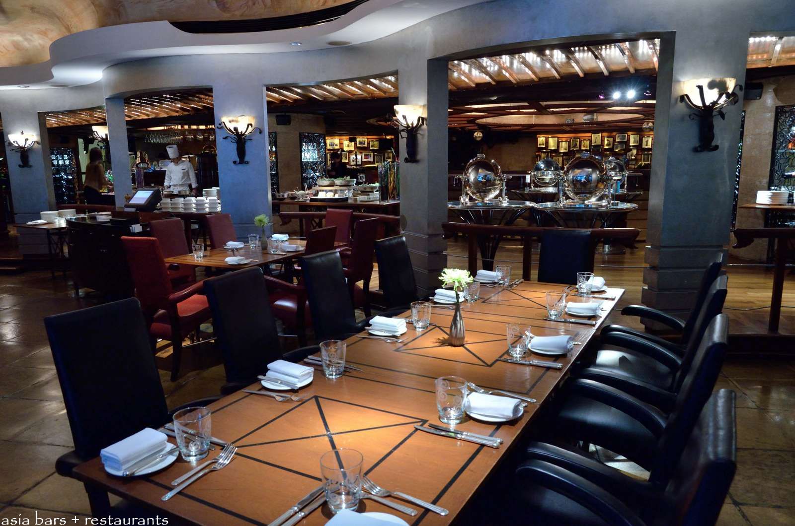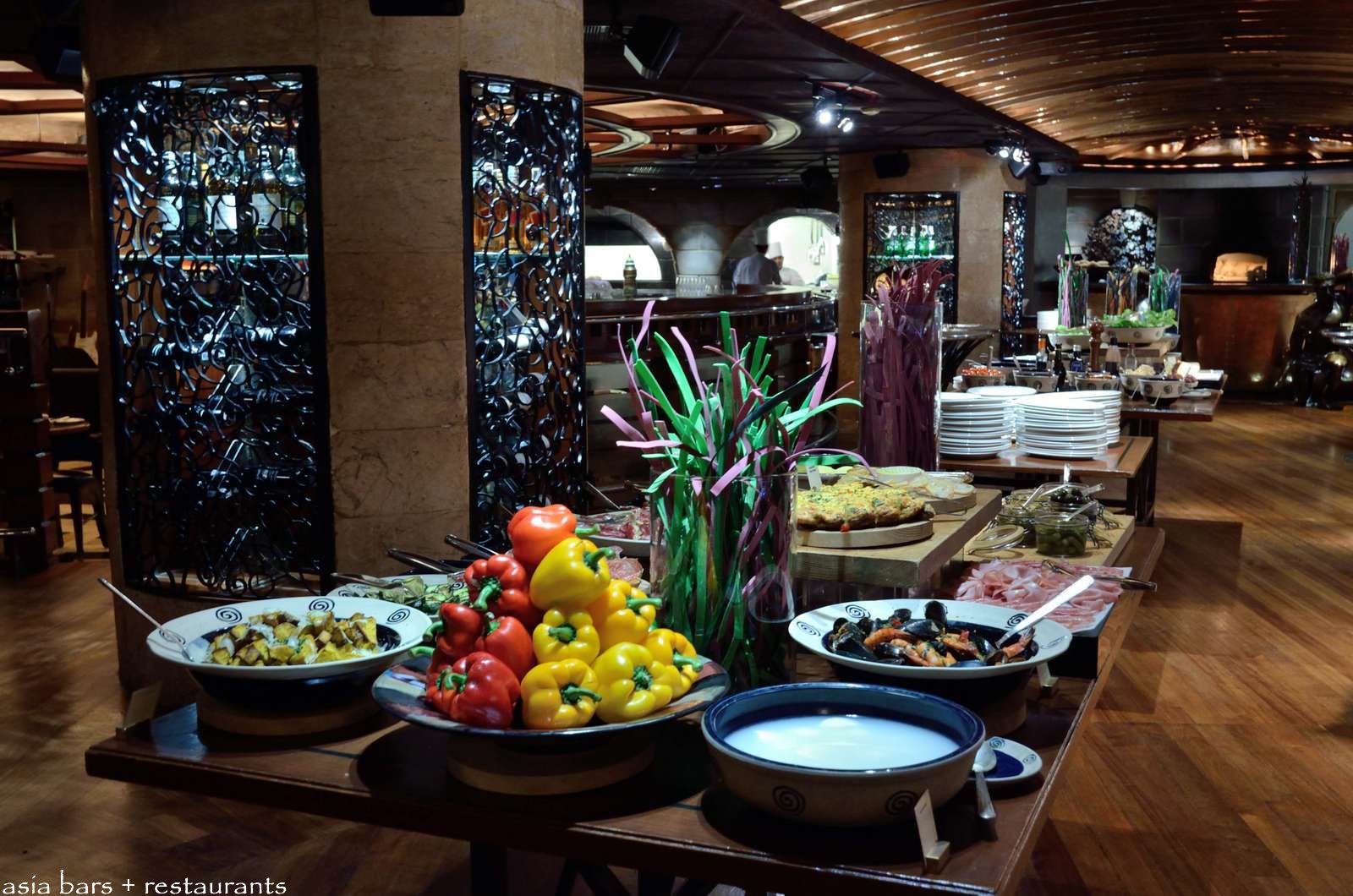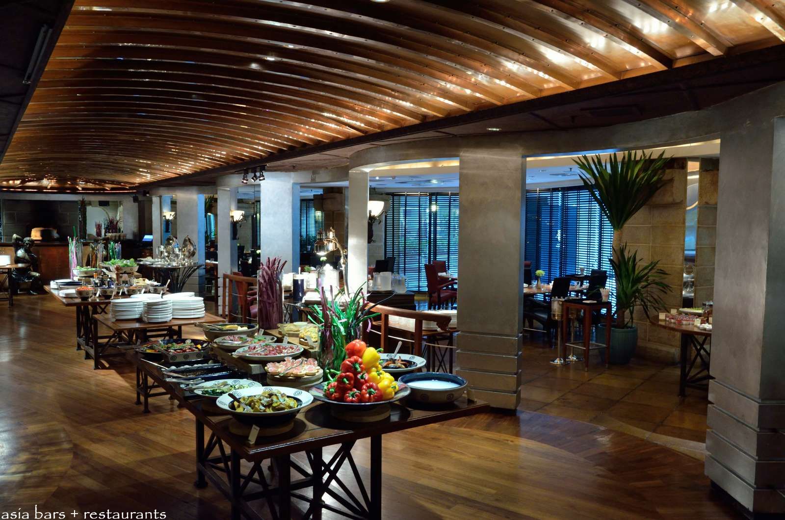 A long central colonnade- with dramatic copper-sheathed vaulted ceiling- separates the dining area of the restaurant on one side, from the bars and dance floor on the other. For the lunch service- the antipasto tables adorn this section.