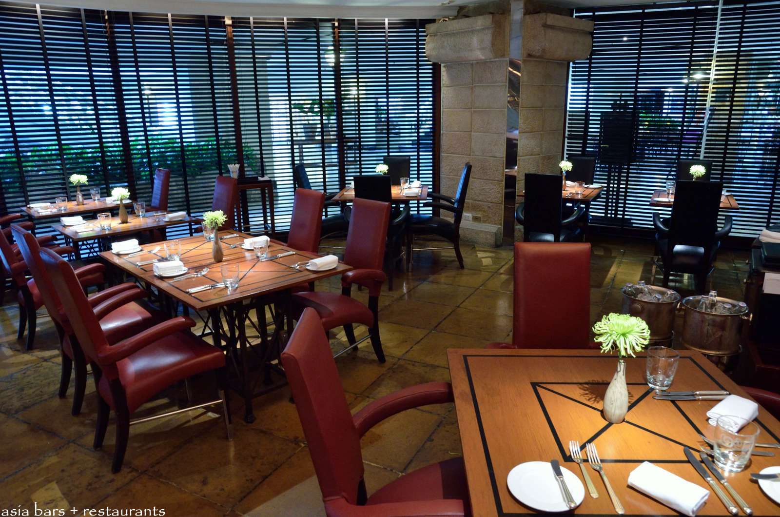 During the day, the full height glass facade suffuses the restaurant dining tables with natural light- the blinds close at night to create a more intimate atmosphere.