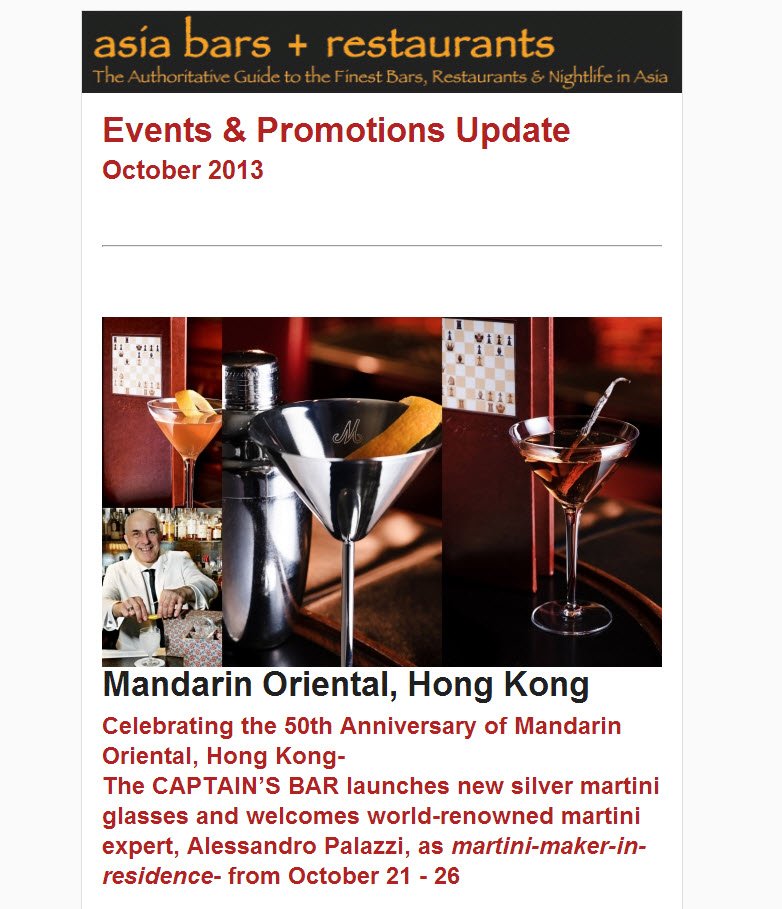 Asia Bars & Restaurants Newsletter- Events & Promotions- October 2013 Asia Bars & Restaurants Newsletter with highlighted Events & Promotions- October 2013 Click here to view the complete Newsletter Share article: Google Plus 0 Share 1 Tweet 0