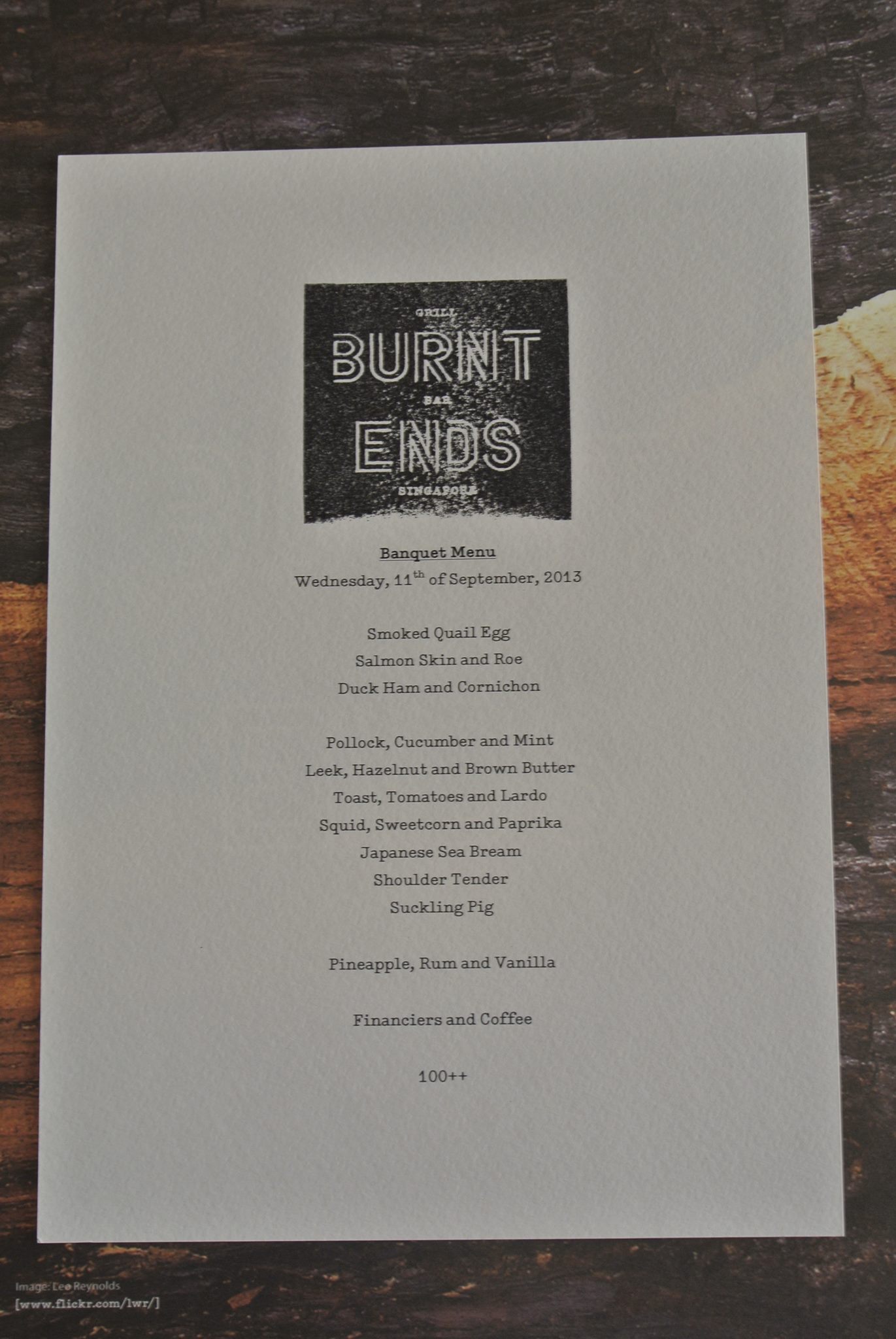 With a focus on cooking only the best market fresh produce- the menus at Burnt Ends are composed daily- inclusive of signature and popular dishes that generally remain available on a daily basis. Deftly utilising the full potential of the wood-fired ovens and grills, the culinary team execute varying cooking techniques such as smoking, slow roasting, hot roasting, baking, grilling and cooking directly on coals to best capture and enhance the flavors of each kind of produce. Menus typically offer selections of seafood, vegetables, meats such as beef, offal and suckling pig, and several desserts.