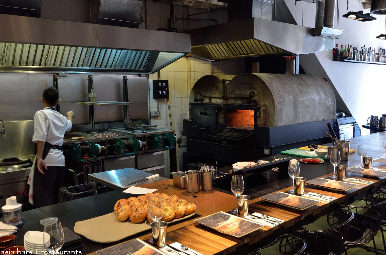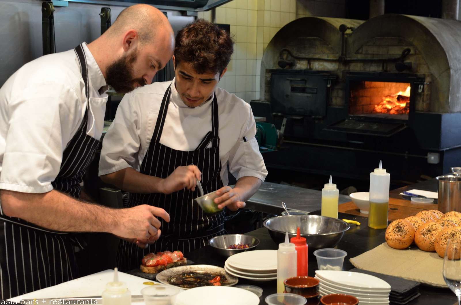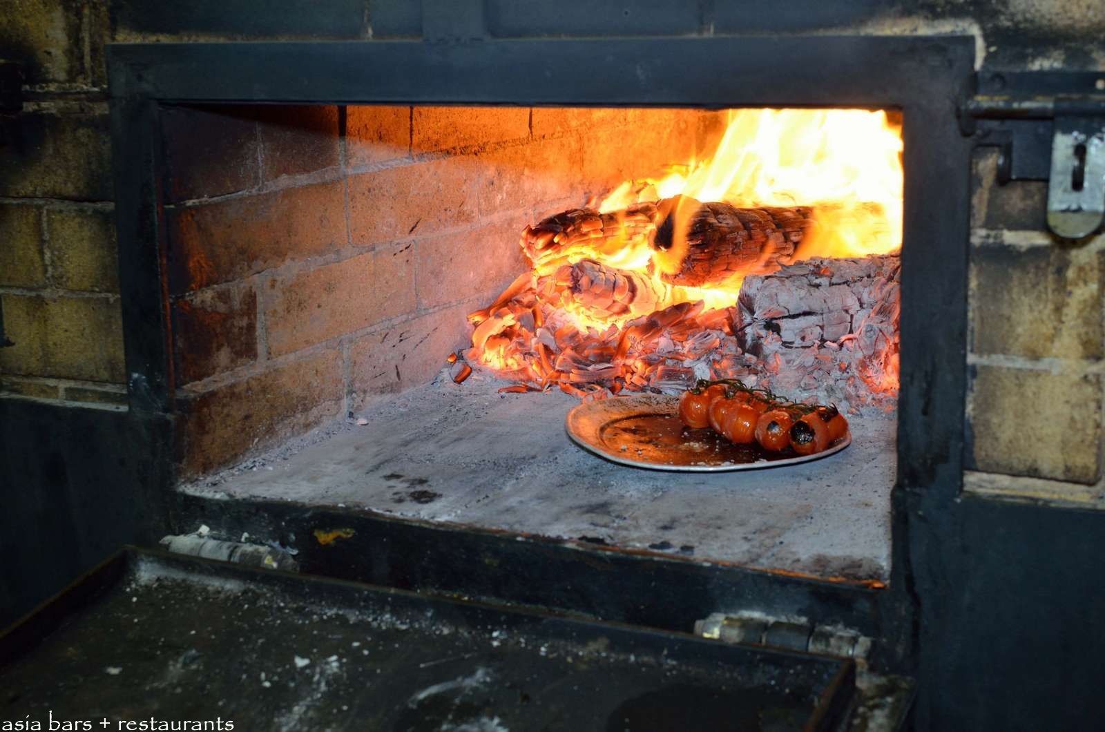 The impressive heart of the kitchen- custom-built on site- the twin chamber, wood-fired oven; and adjacent, three side-by-side, pulley-adjusted heavy steel grills that cook over coals taken from the ovens.