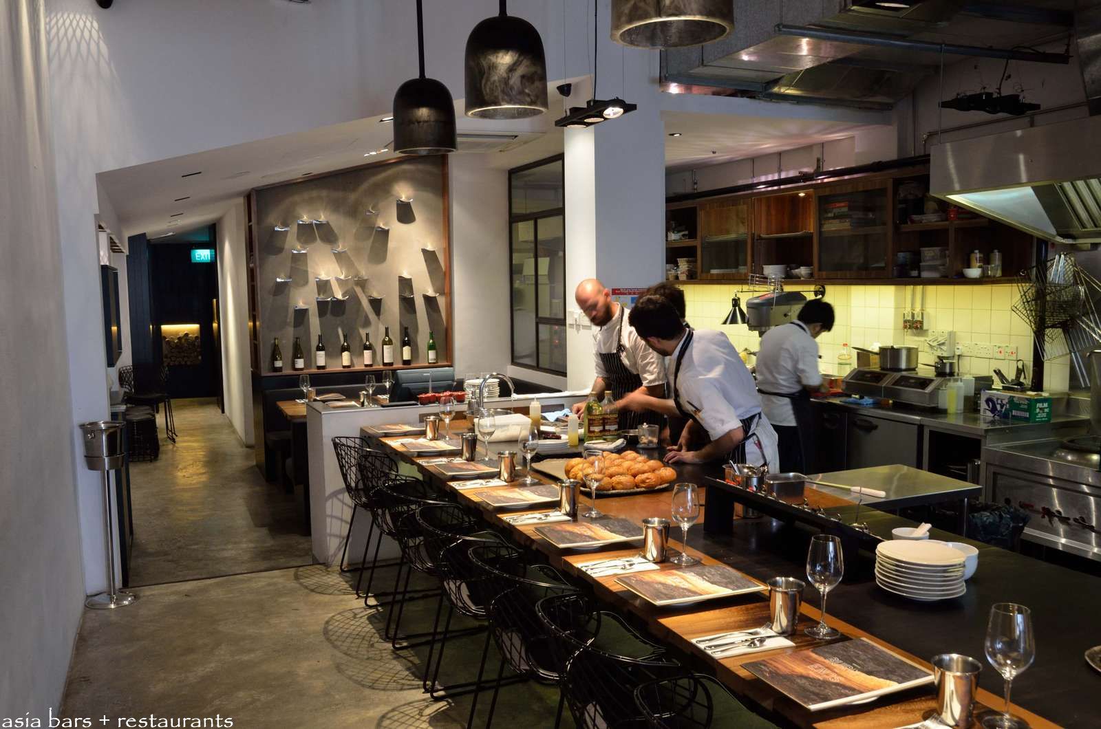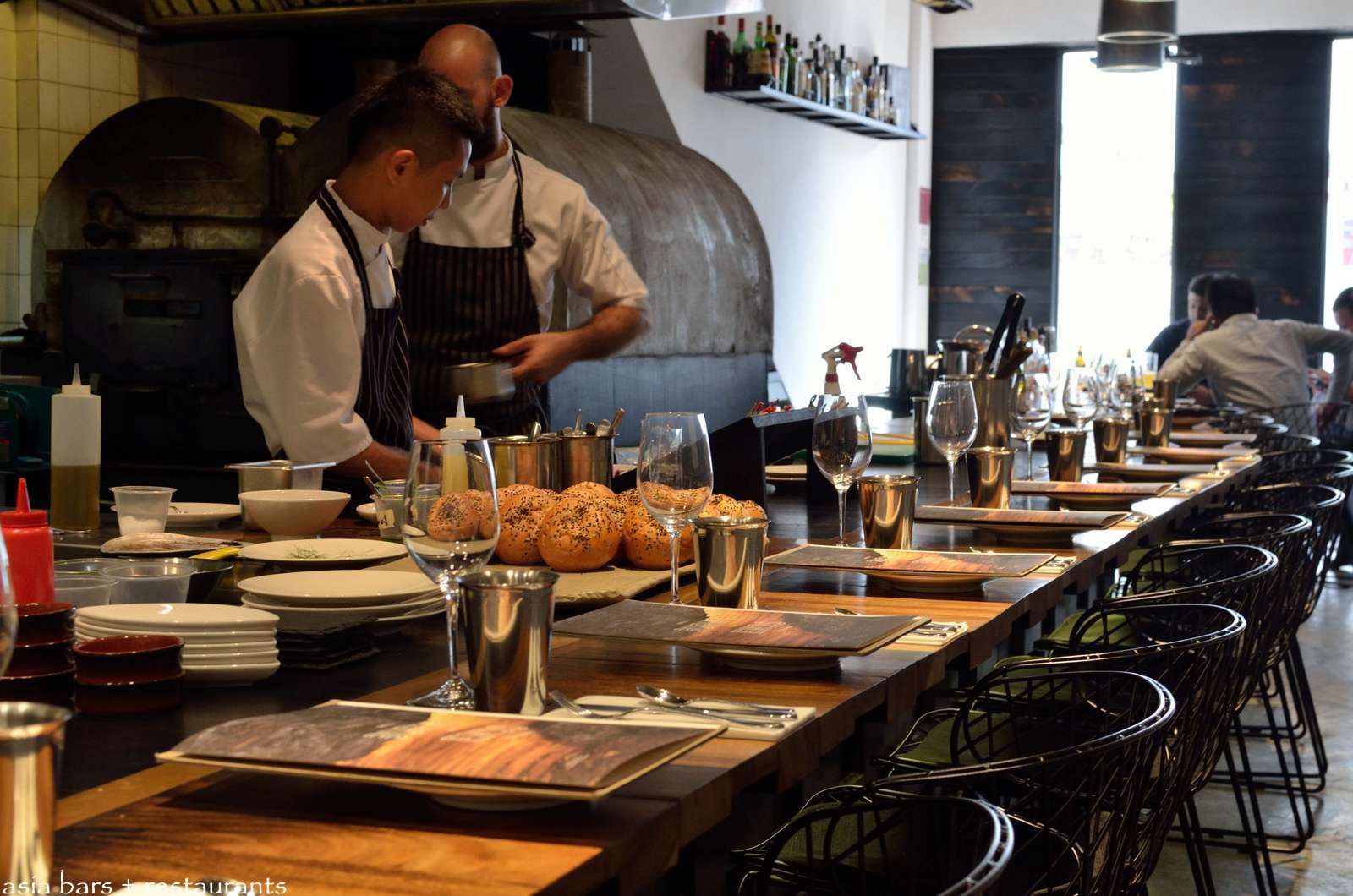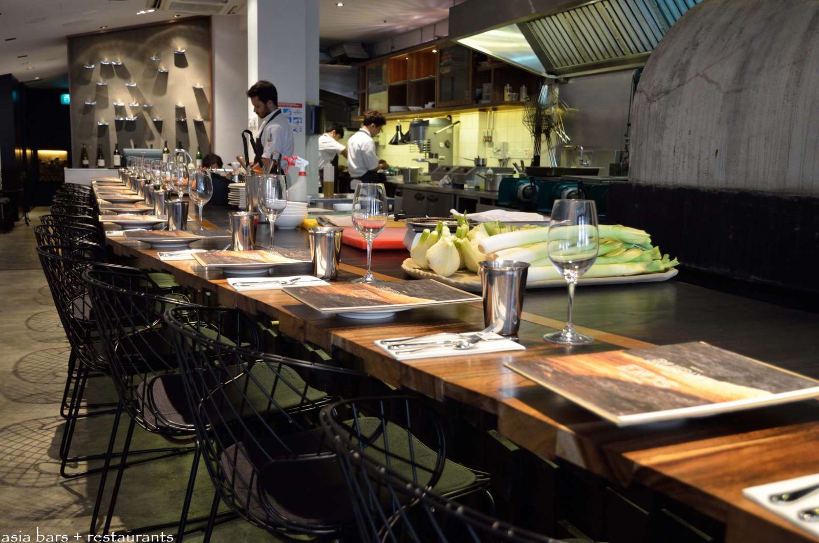 A handsome solid timber counter extends the length of the room- seating 18 diners in low-slung black wire mesh chairs.