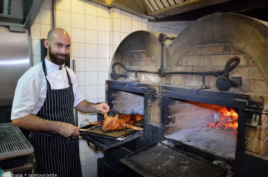 Chef David Pynt- slow roasting a Suckling Pig- utilising only heat generated from the adjacent oven chamber.