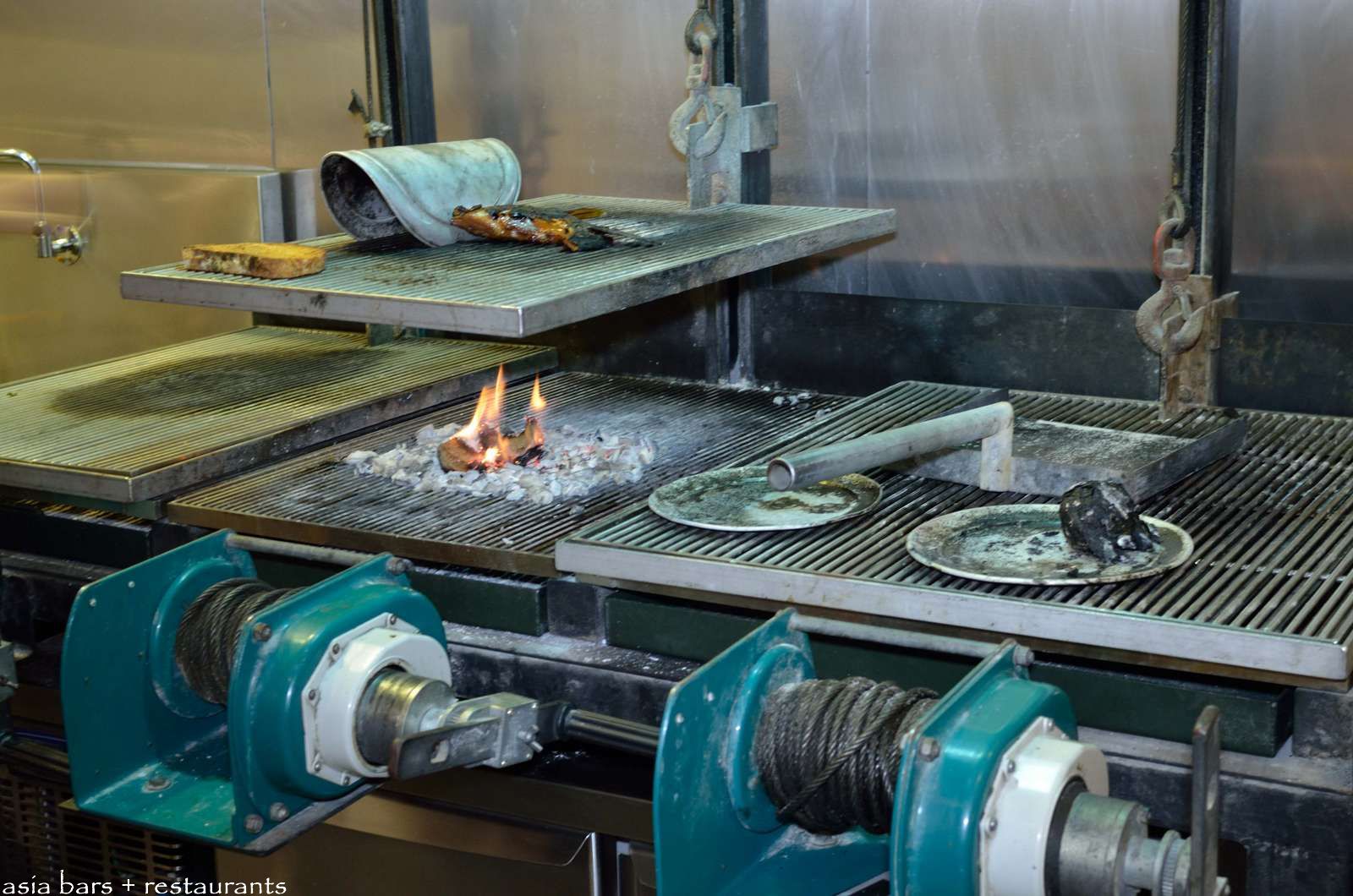 Custom-engineered charcoal grills- with manually operated winch cables precisely adjusting the cooking height and temperature specifically for each of the three grills.