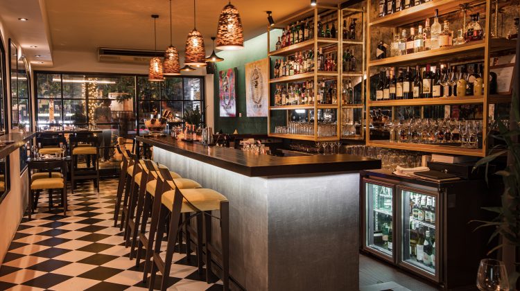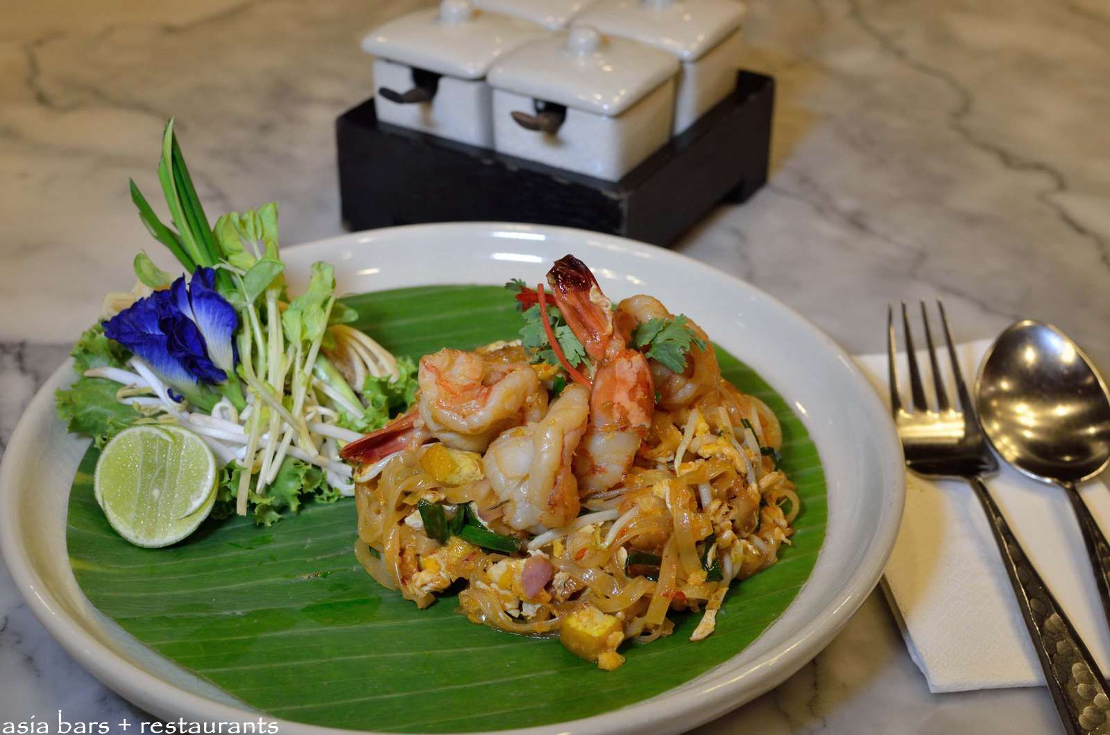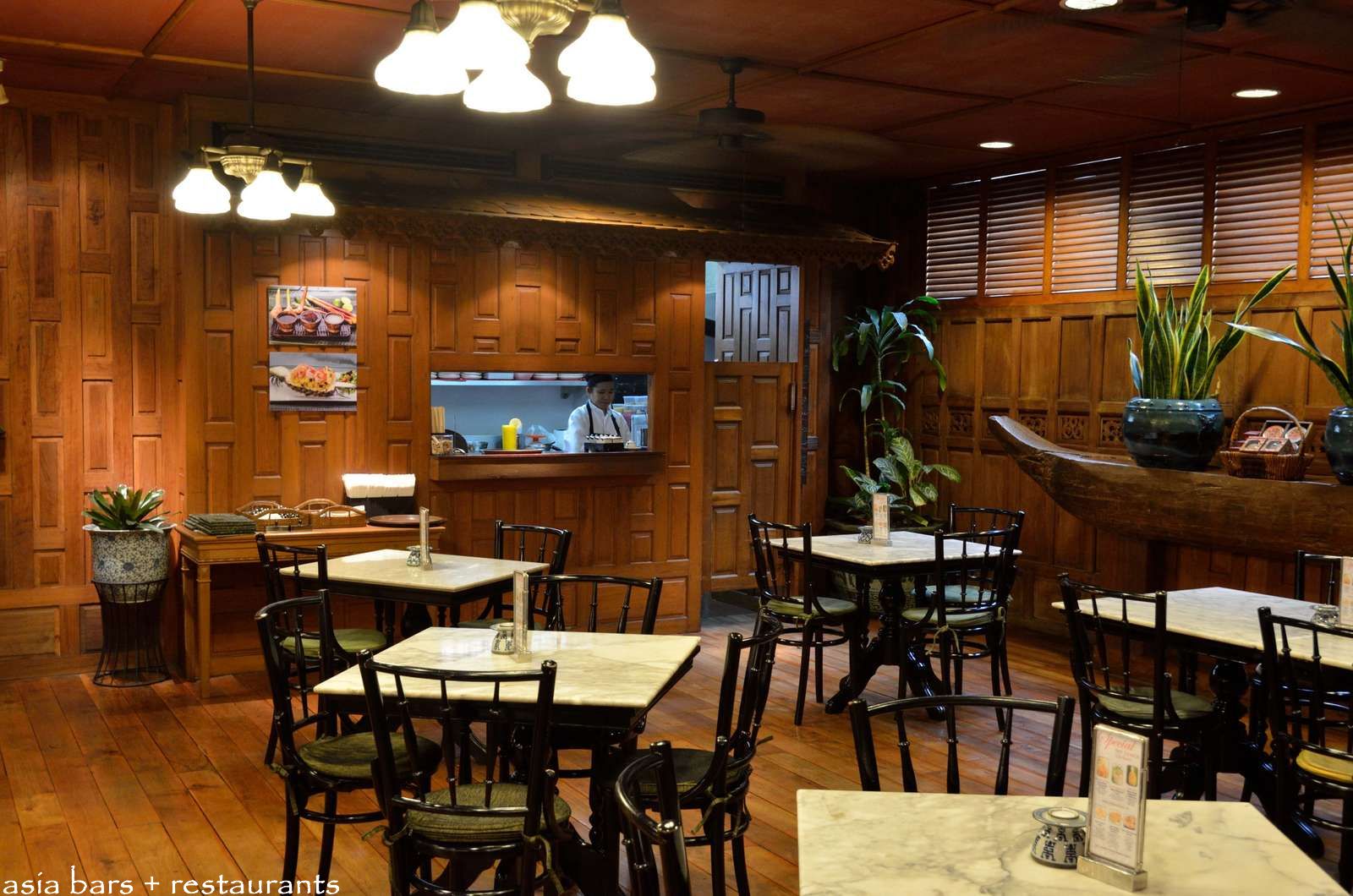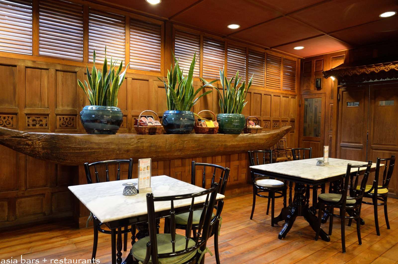 Traditional Thai design elements blend with classic cafe furniture to evoke a sense of casual elegance.