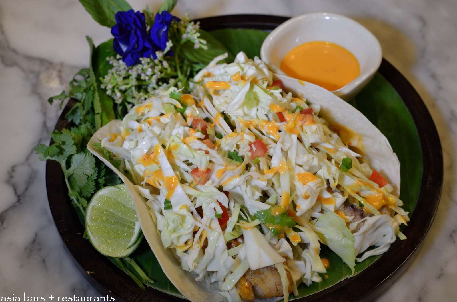 Baja-Thai Fish Taco ทาโก้ปลา – A soft flour tortilla filled with lightly fried red snapper, tomatoes, coriander, onions. Topped with shredded cabbage and Thompson “Thai-styled” baja sauce. B320