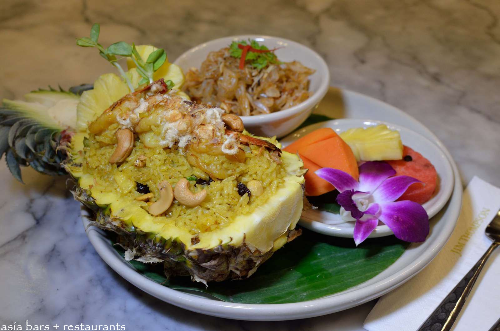 Khao Phad Sappalot Goong- ข้าวผัดสับปะรดกุ้ง- Pineapple fried rice with prawns, onions and black raisins served in a pineapple. B250. Served with Pomelo Salad.
