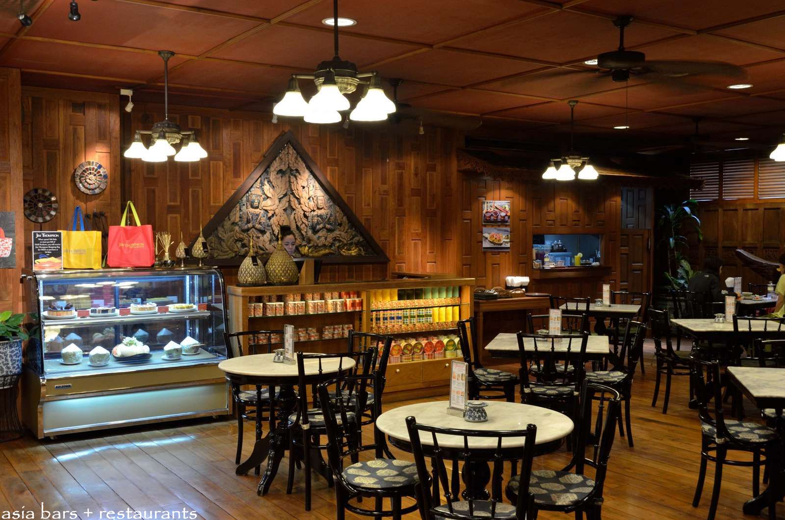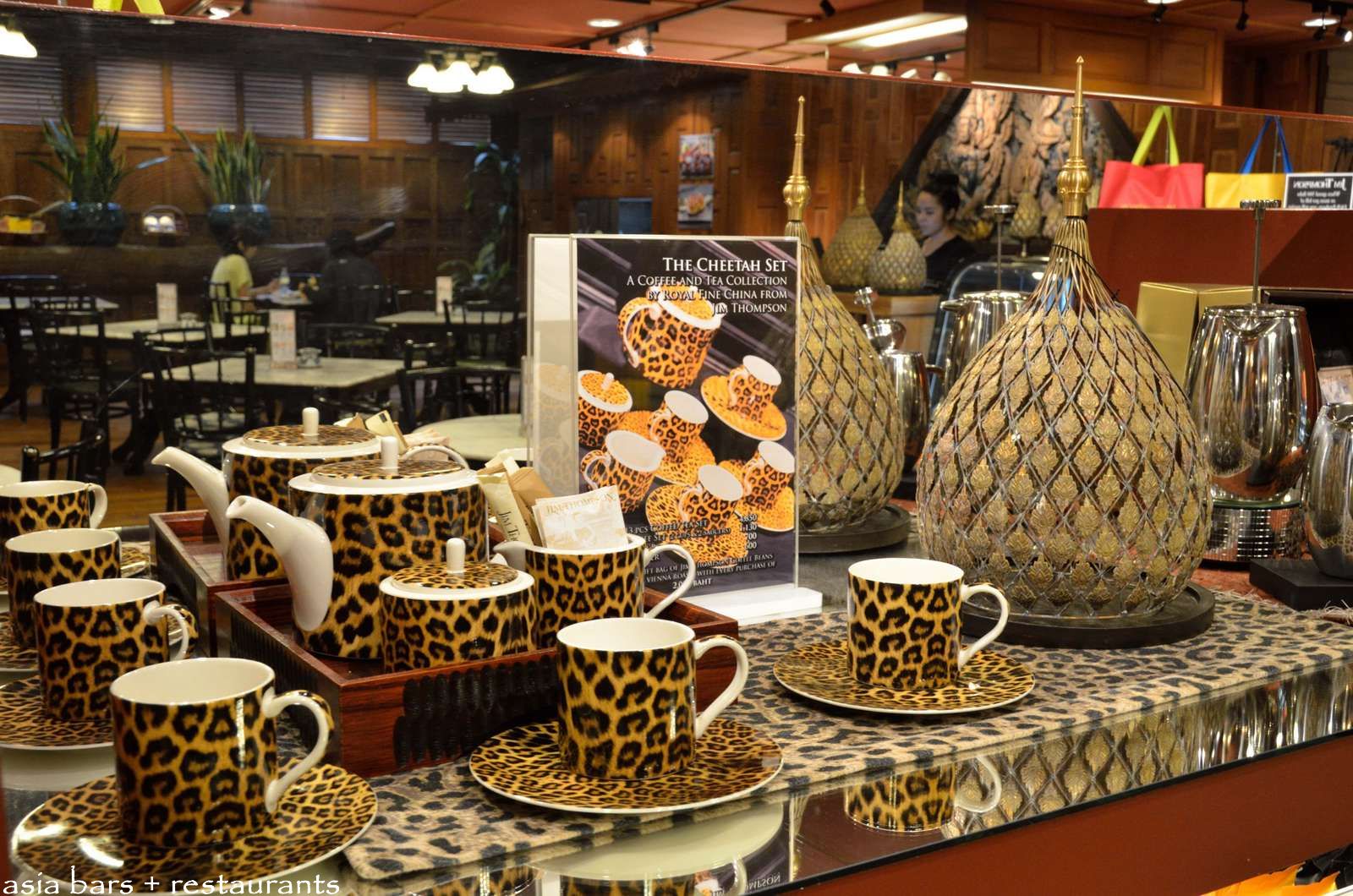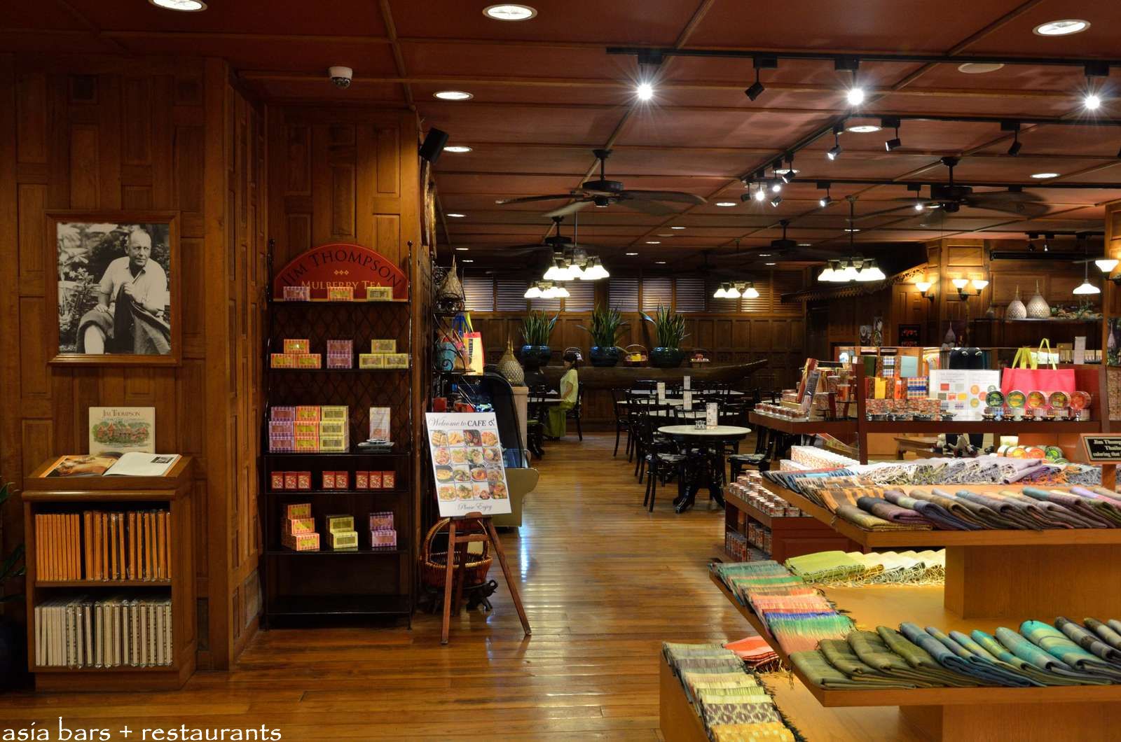 Display units within the cafe showcase Jim Thompson branded culinary products- including fine china coffee and tea sets, mulberry teas, dried fruits, and rice crackers.