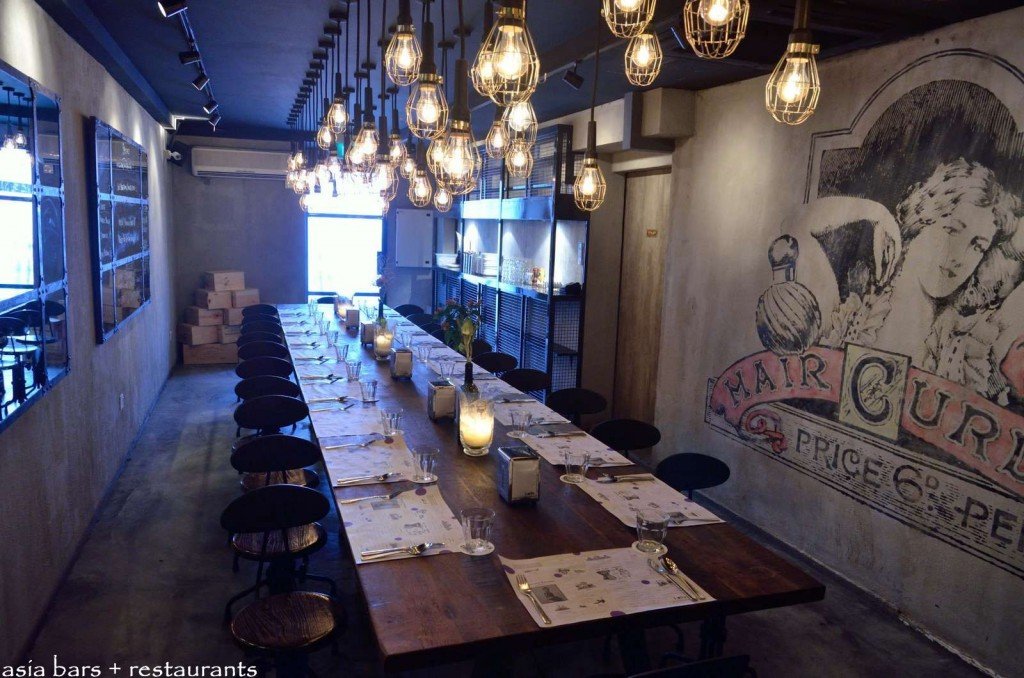 An impressive solid timber communal table seats up to 22 diners in the basement level room. Suspended vintage incandescent lamps suffuse the room with a subdued lighting effect.