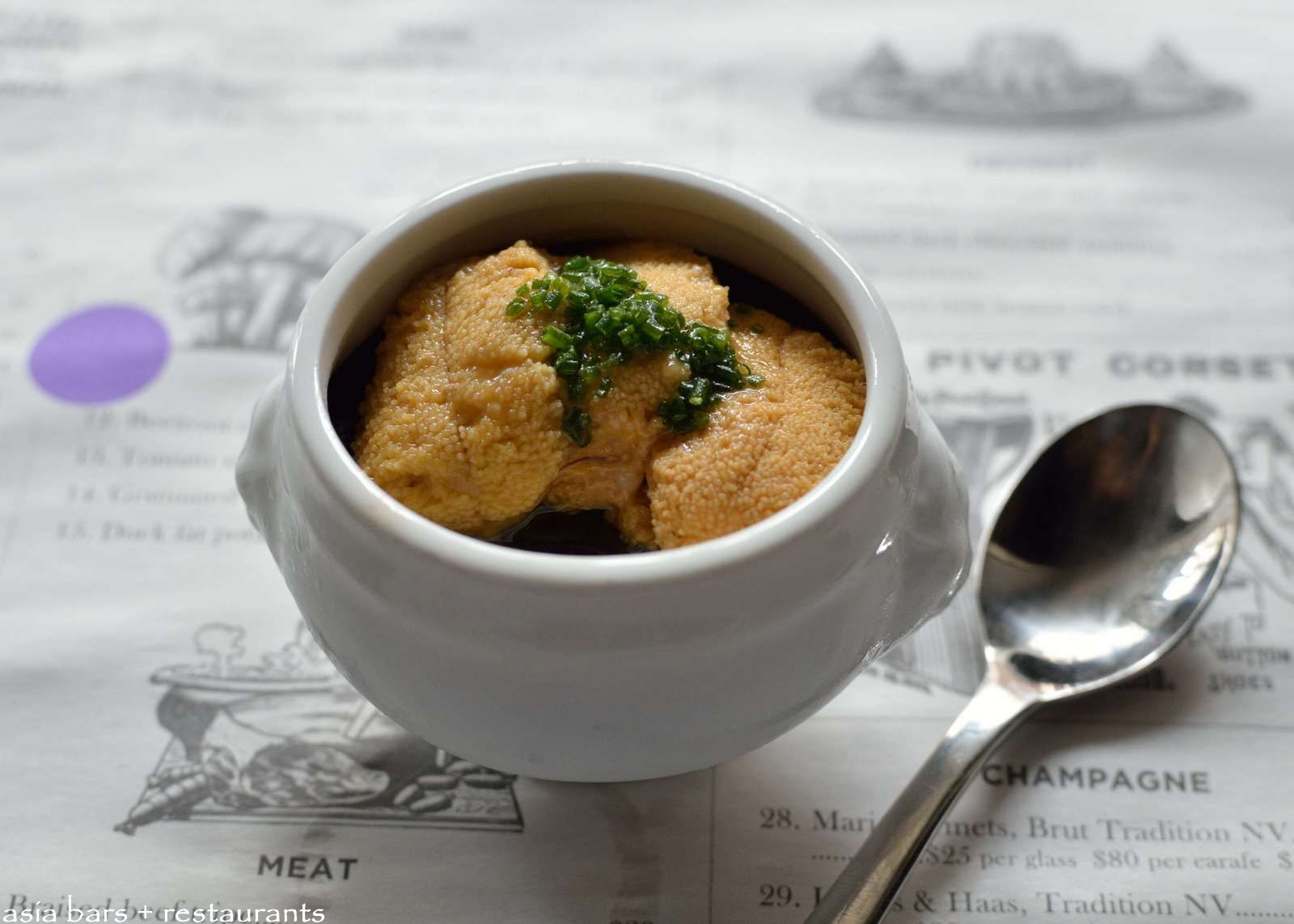 Sea Urchin Pudding- pudding made from squid ink, egg yolks, and cream, topped with sea urchin and chives.