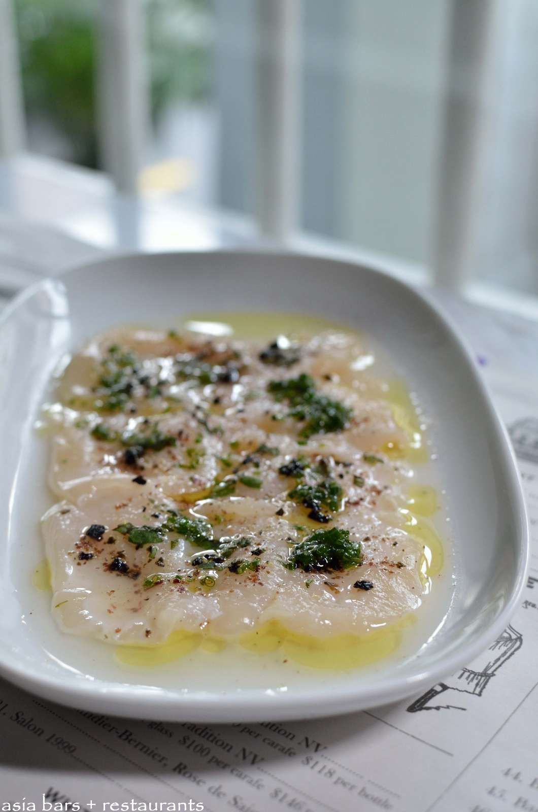 Hokkaido Scallop Carpaccio- diver caught scallop from Hokkaido, dressed in chives and extra virgin olive oil.