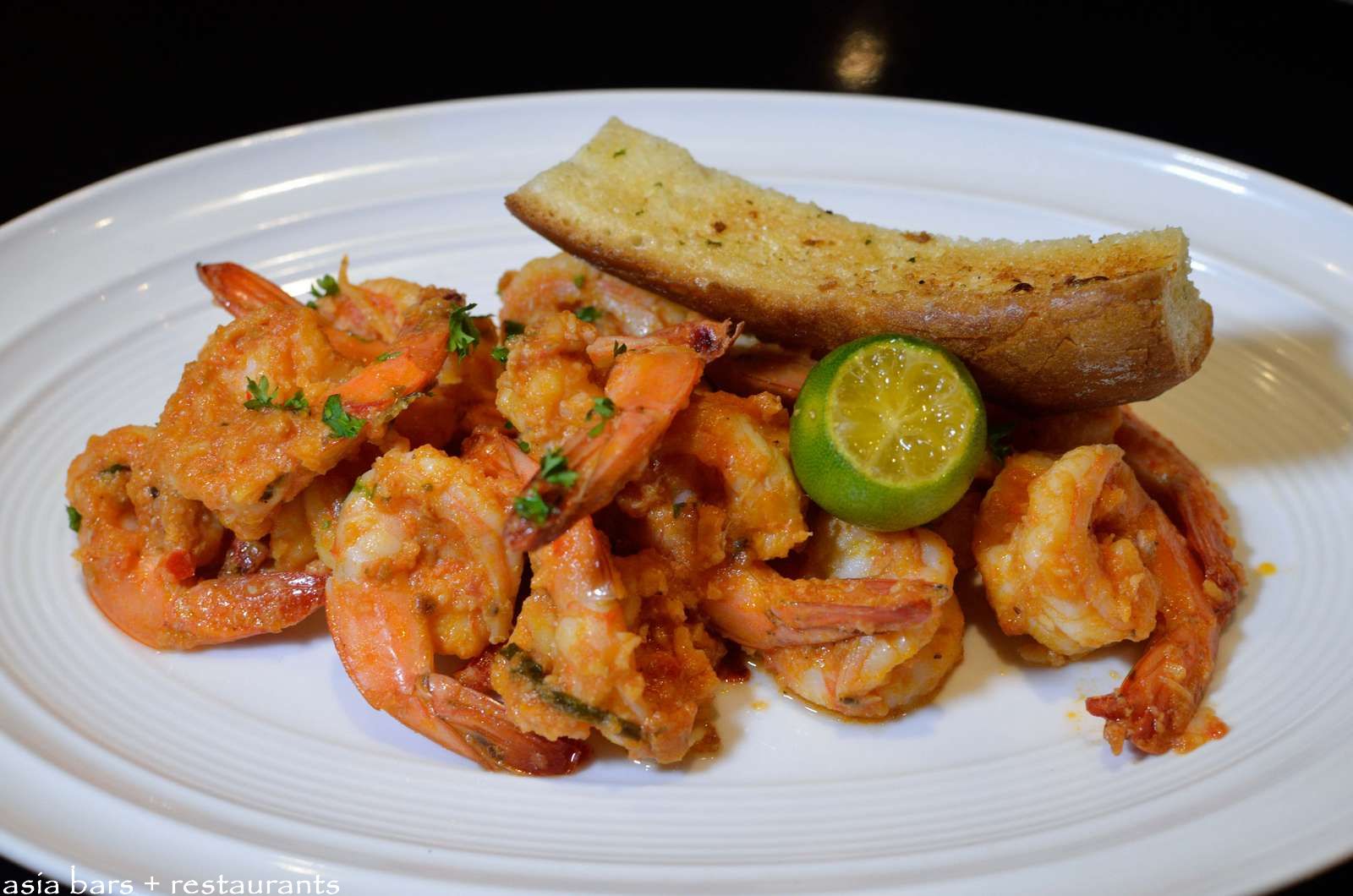 Gambas- Prawns + garlic + spicy tomato + garlic bread