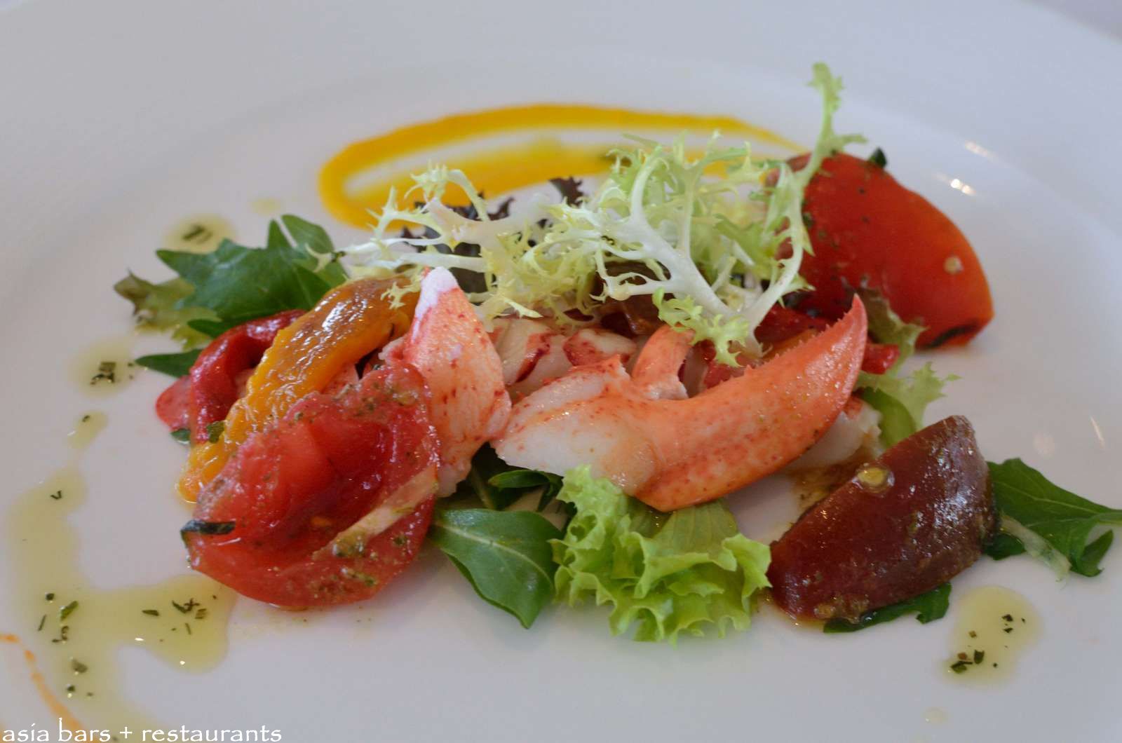 Astice- Sweet Half Maine Lobster Dressed in His Coral with Roasted Peppers and Basil Salad.